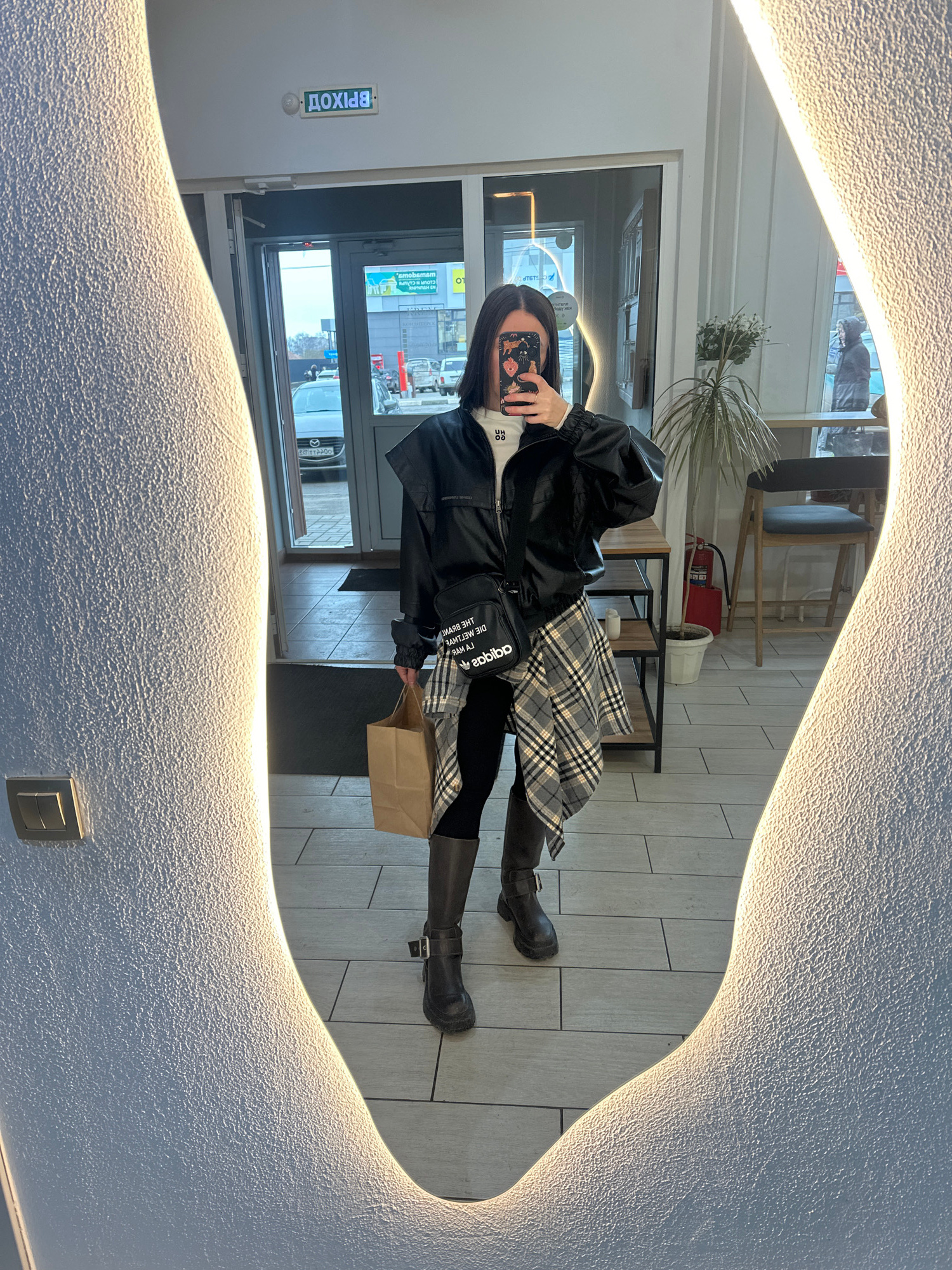 A person is reflected in an illuminated mirror. The individual is wearing a black jacket, a plaid skirt, leggings, and knee-high boots. They are holding a brown paper bag. The location appears to be i…read more