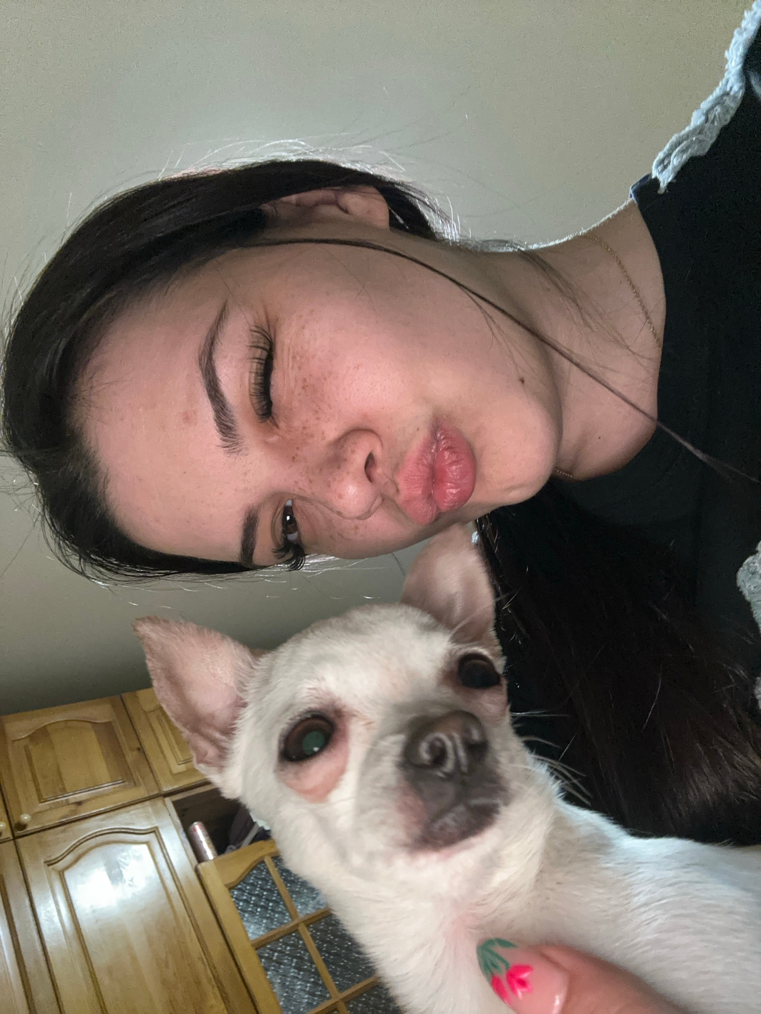 A woman with dark hair and freckles is making a kissing face while holding a small, white dog with brown spots around its eyes. She is wearing a black top and a silver necklace. The dog is held close…read more