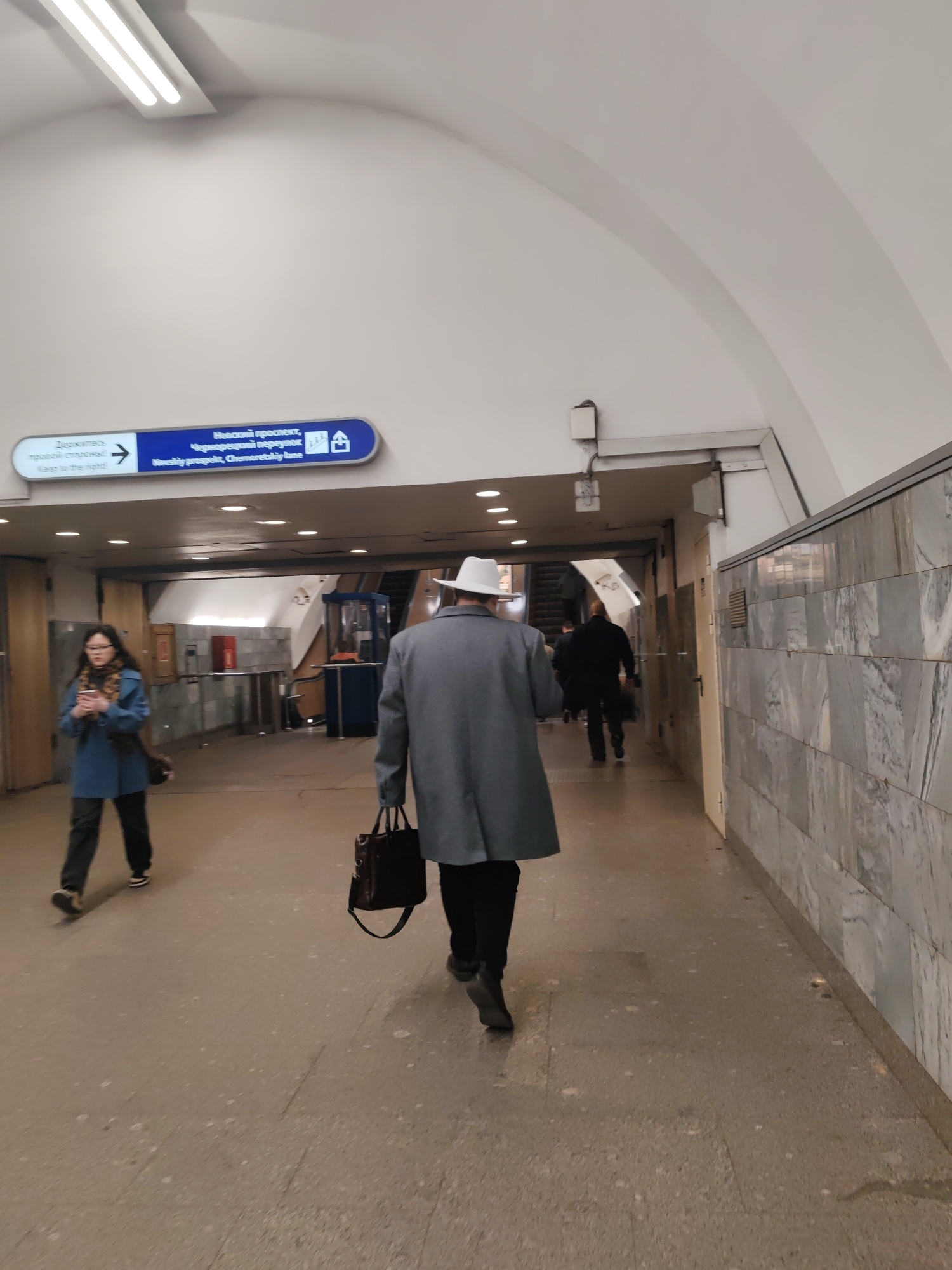 This vertical shot captures an underground pedestrian passage, likely within a metro station in Saint Petersburg, Russia. The scene depicts several commuters moving through the brightly lit, arch-ceil…read more