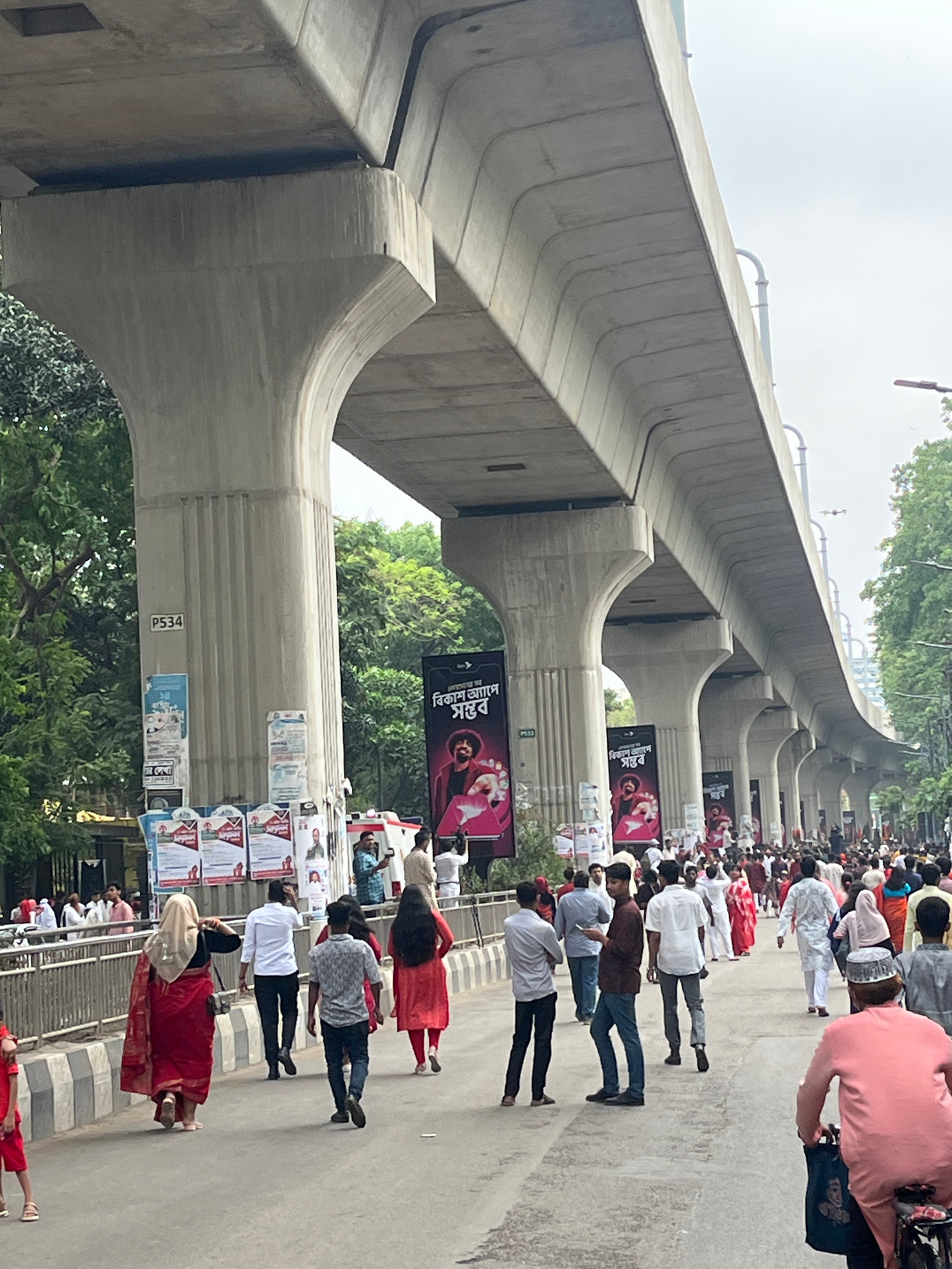 A long line of people walks along a street in Dhaka, Bangladesh, under an elevated concrete structure with pillars marked "P534". The crowd consists of diverse individuals, some wearing white shirts a…read more