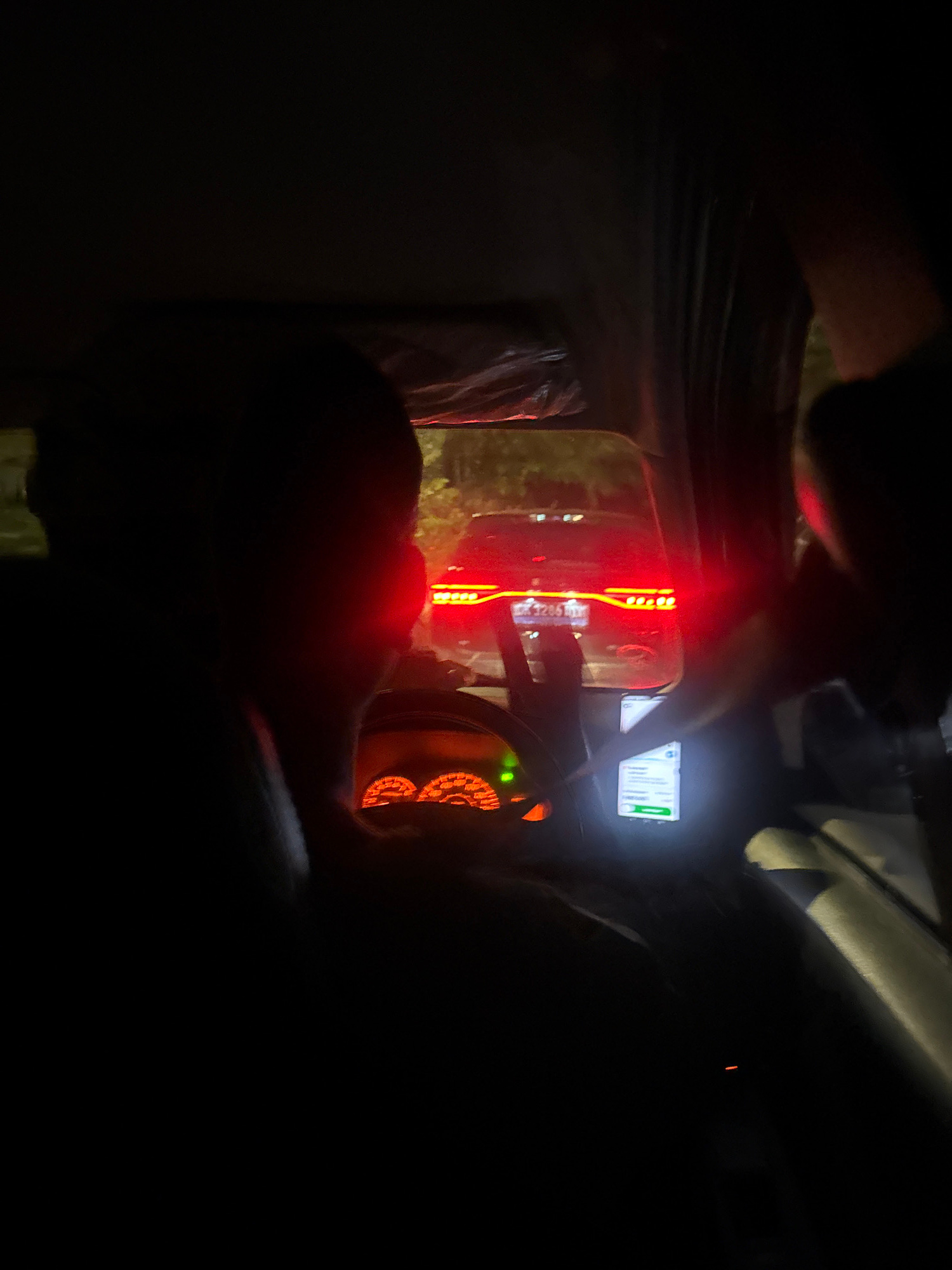 The media depicts the dark interior of a vehicle at night, likely captured from a passenger's perspective, looking towards the front and out the windshield. The scene is dominated by artificial light…read more