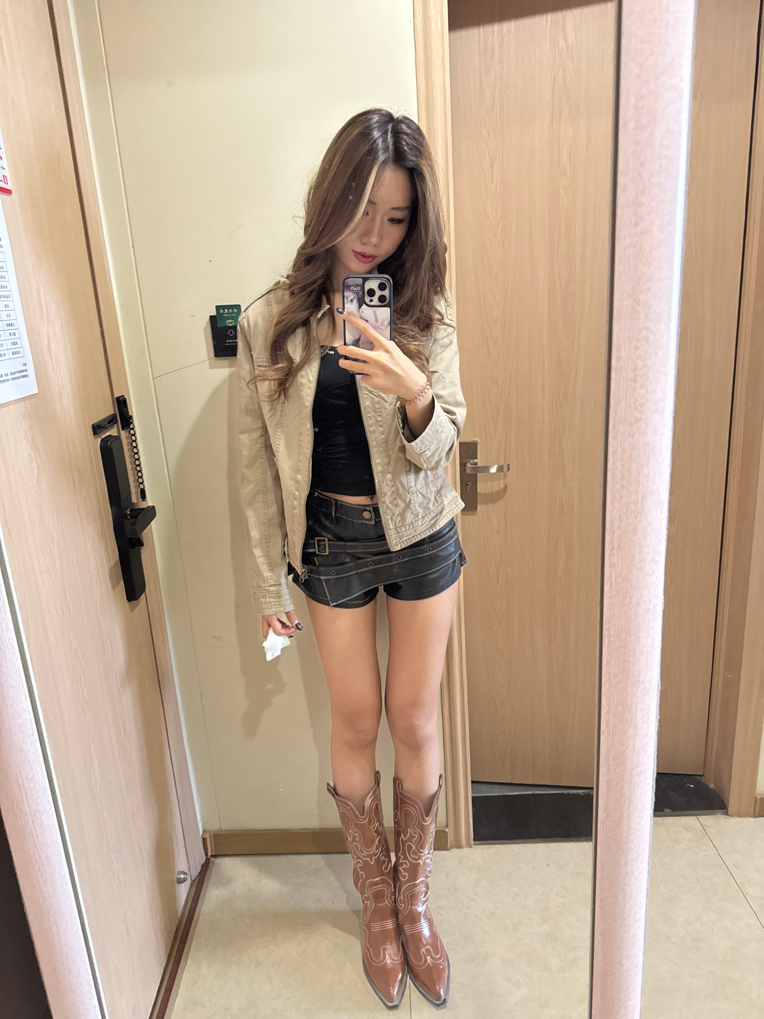 A woman in a mirror selfie, wearing a tan jacket, black top, short black skirt, and cowboy boots. She is holding a smartphone, with a partial view of a room in the background. The mirror reflects ligh…read more