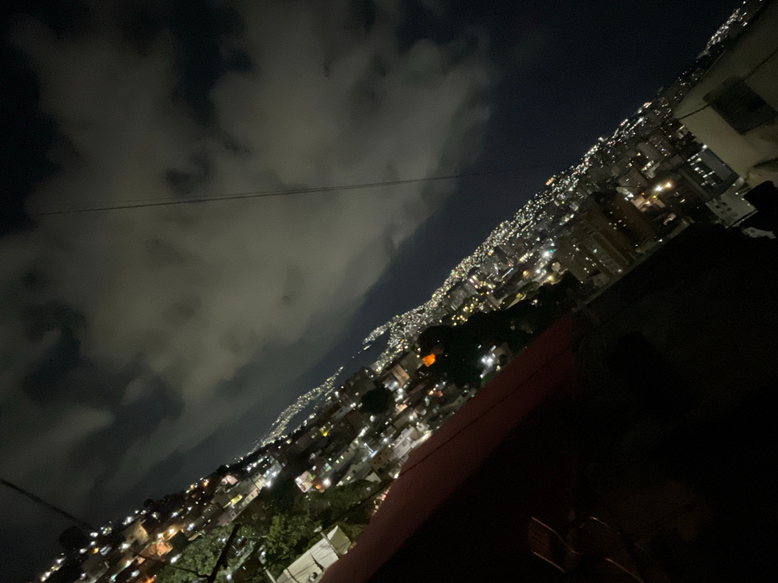 The image depicts a night view of a densely populated area, likely a hillside neighborhood in Caracas, Venezuela. The sky is filled with heavy clouds. Below, numerous lights from houses and buildings…read more