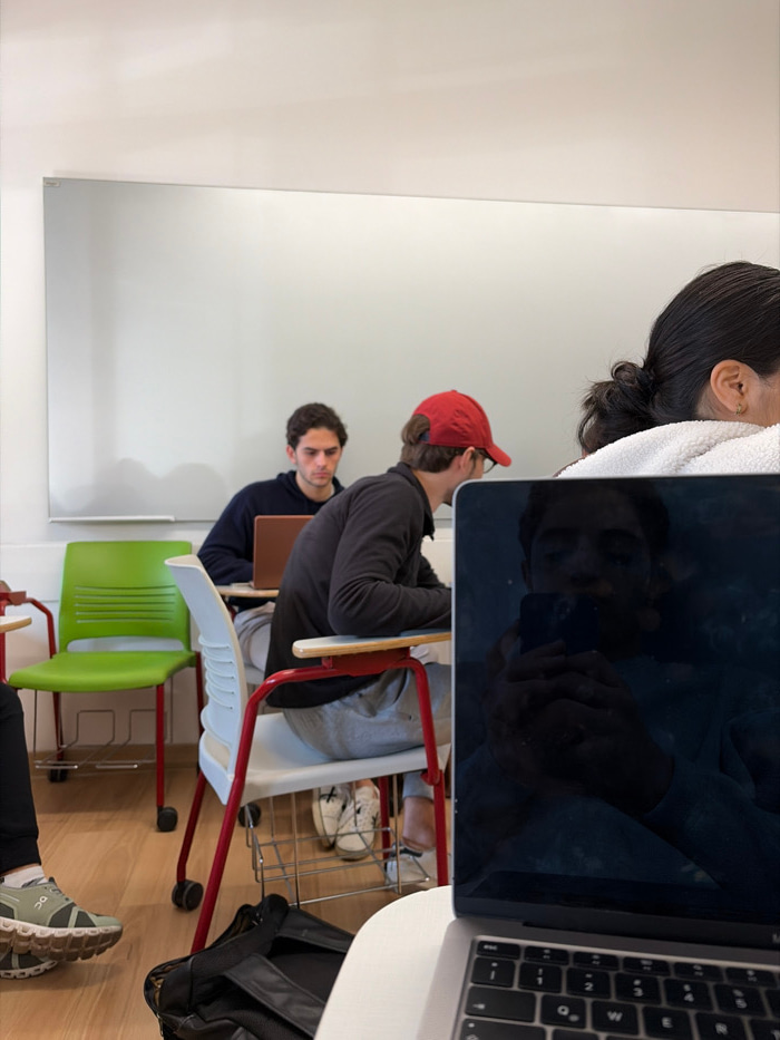 The image captures an indoor scene within a classroom or study area in Mexico City, Mexico, depicting multiple individuals seated and engaged with electronic devices. The perspective is from a seatedβ¦read more