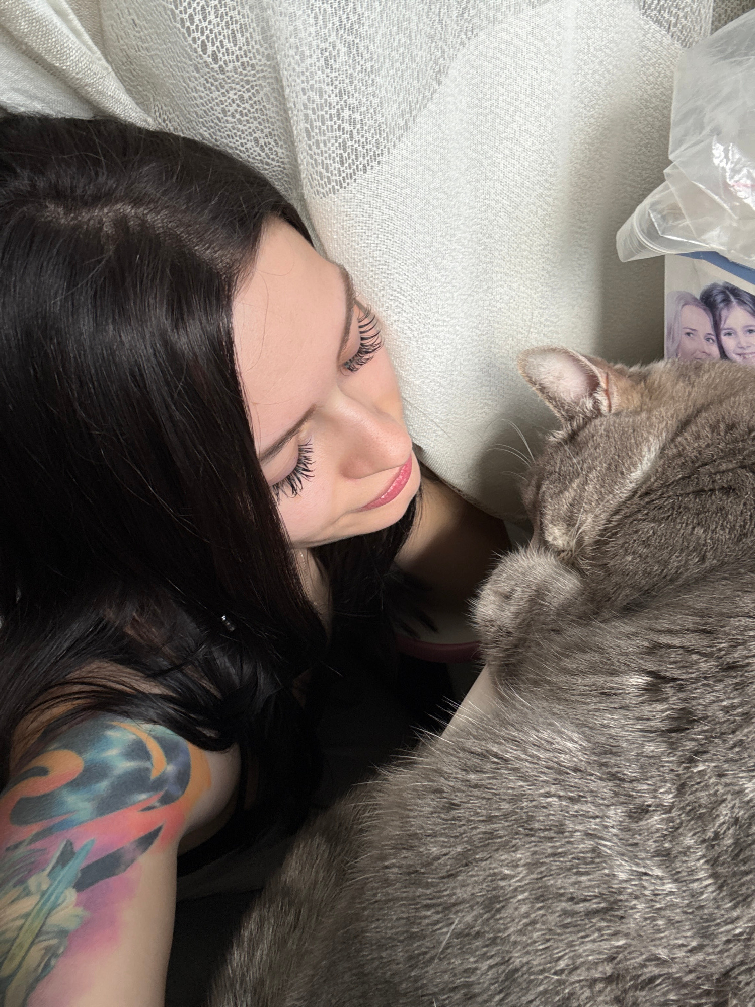 A woman with dark hair lies on a white textured surface, her face turned upwards. Her eyes are closed, and she has long eyelashes. A large grey cat stands over her, its head close to her neck, possibl…read more