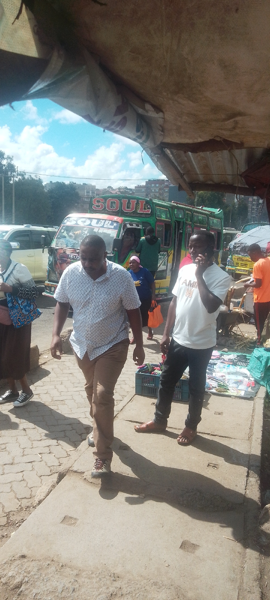 This image depicts a bustling street scene in Nairobi, Kenya, under strong daylight with a blue sky and scattered white clouds. An overhead, makeshift canopy of weathered fabric and corrugated metal p…read more