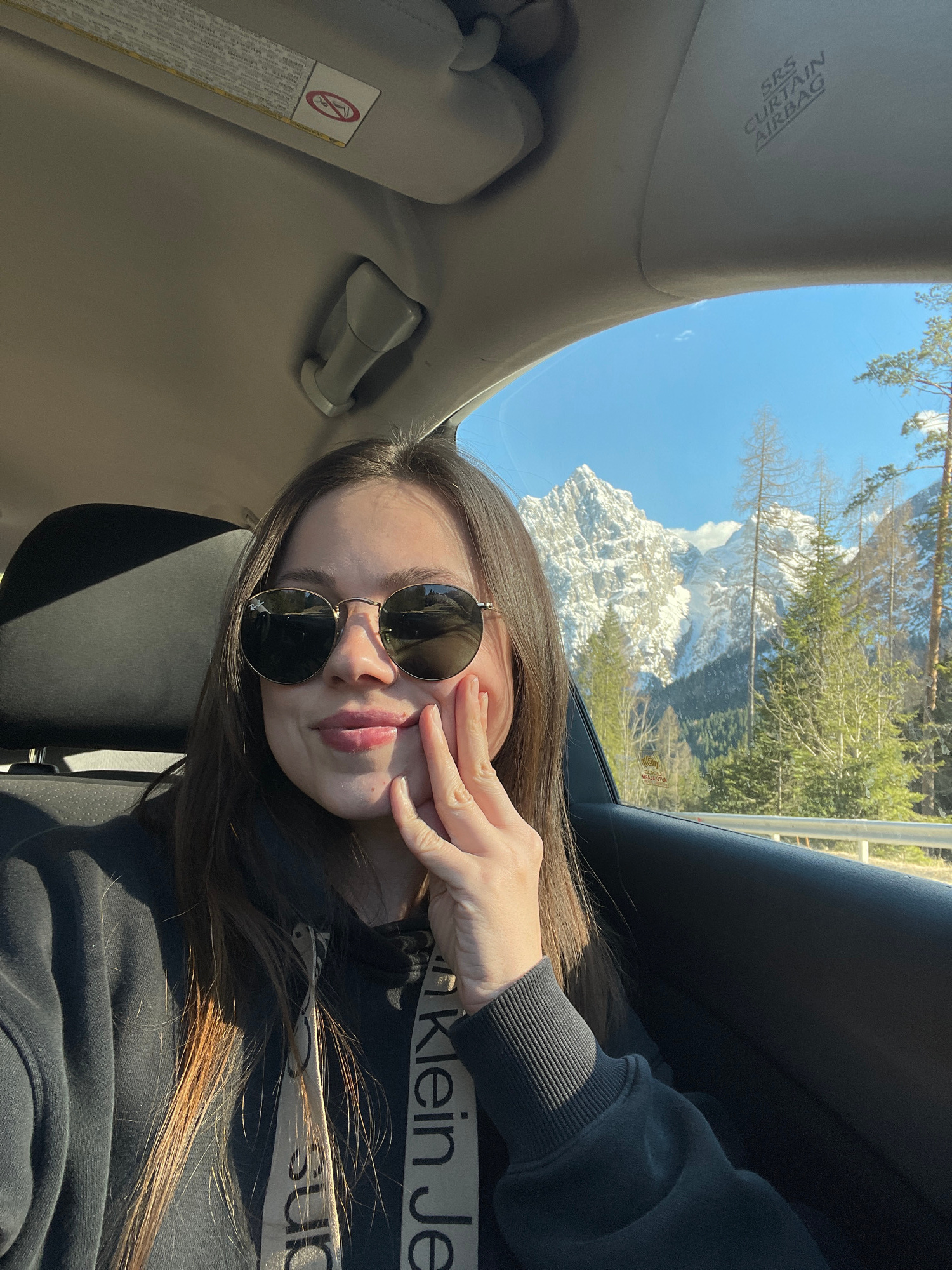 A young woman is in the passenger seat of a car in Auronzo di Cadore, Italy, with a view of the snow-capped Dolomites mountains outside the window. The car's interior is visible, including the visor,…read more