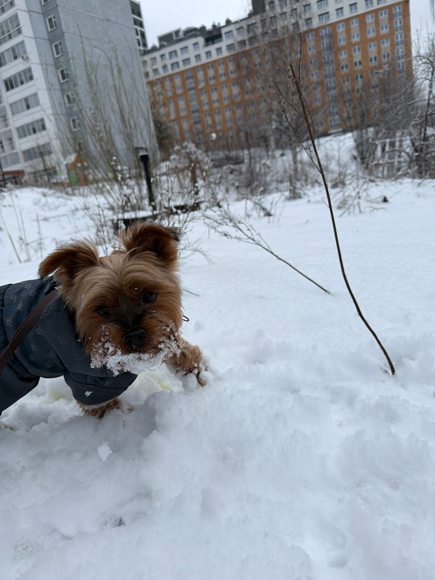 A Yorkshire Terrier puppy is playing in the snow in Izhevsk, Russia. The puppy is wearing a dark blue, patterned winter coat with a brown strap. The puppy's face is covered in snow, but its brown fur…read more