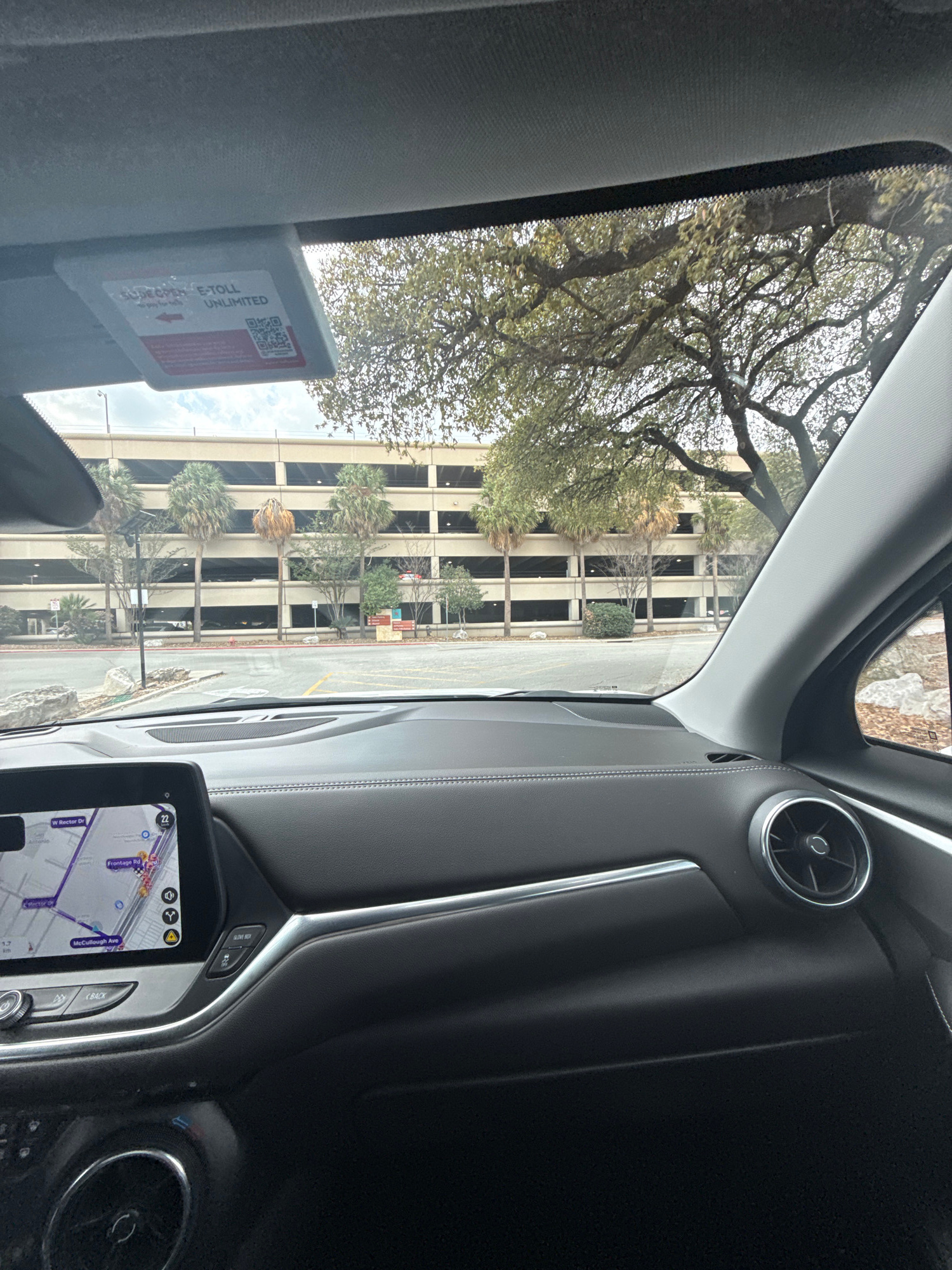 The image, taken from inside a car, shows a view through the windshield of a parking garage in San Antonio, United States. The parking garage is a multi-story building with a light-colored facade and…read more