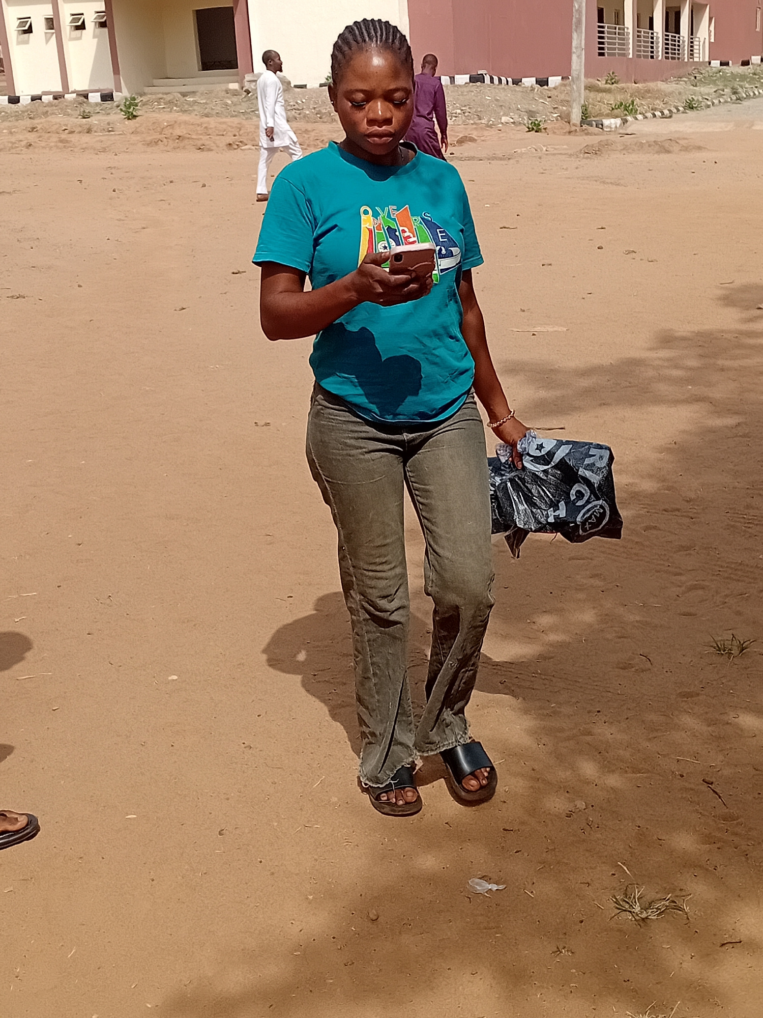 A woman stands outdoors in a sandy area, possibly in Lokoja, Nigeria. She wears a blue t-shirt, green pants, and sandals. She holds a phone in her right hand and a black plastic bag in her left. In th…read more