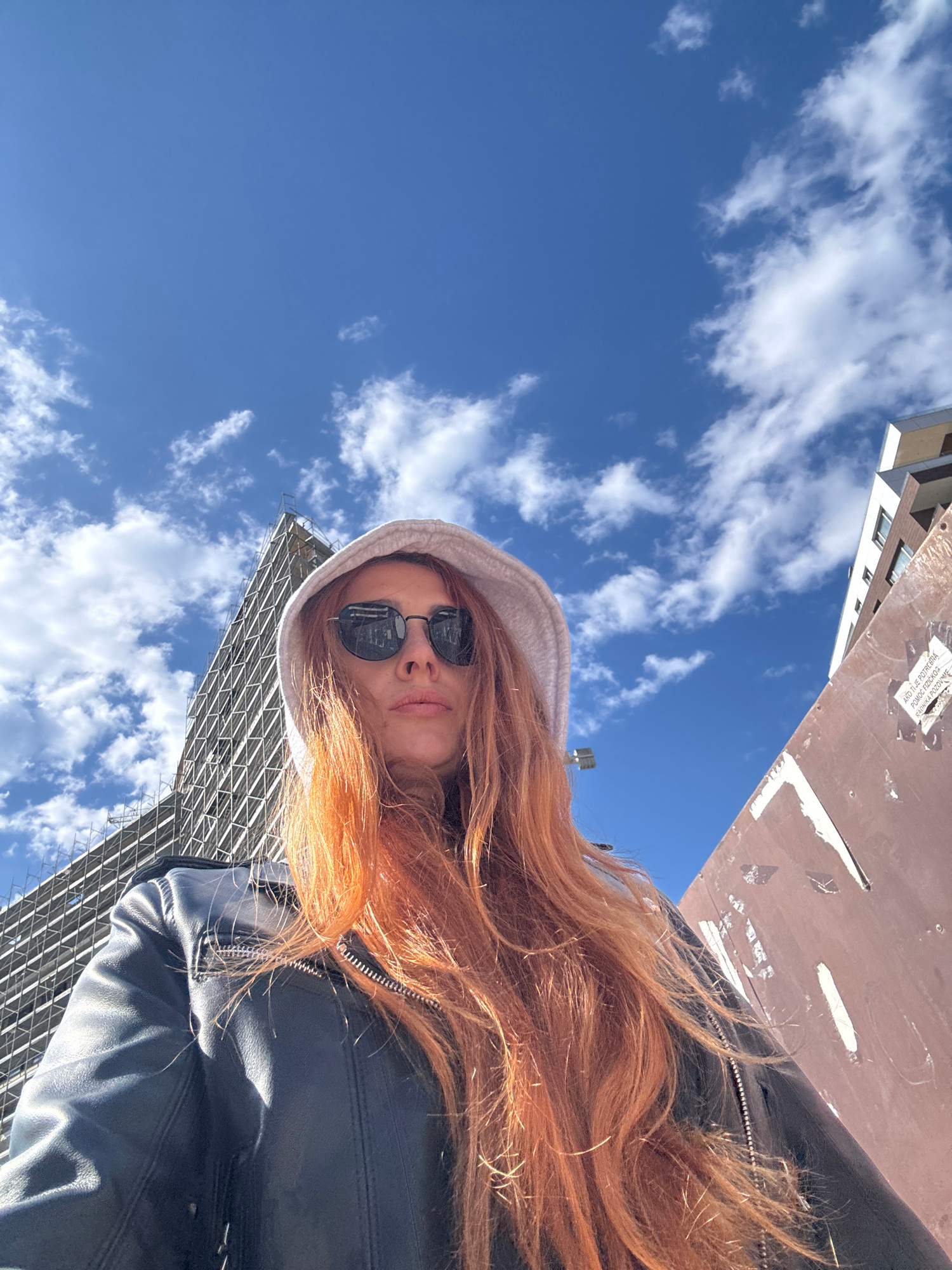 A low-angle perspective captures a woman with red hair wearing sunglasses and a hoodie. She is outside, likely in an urban setting. The background includes a bright blue sky with scattered white cloud…read more