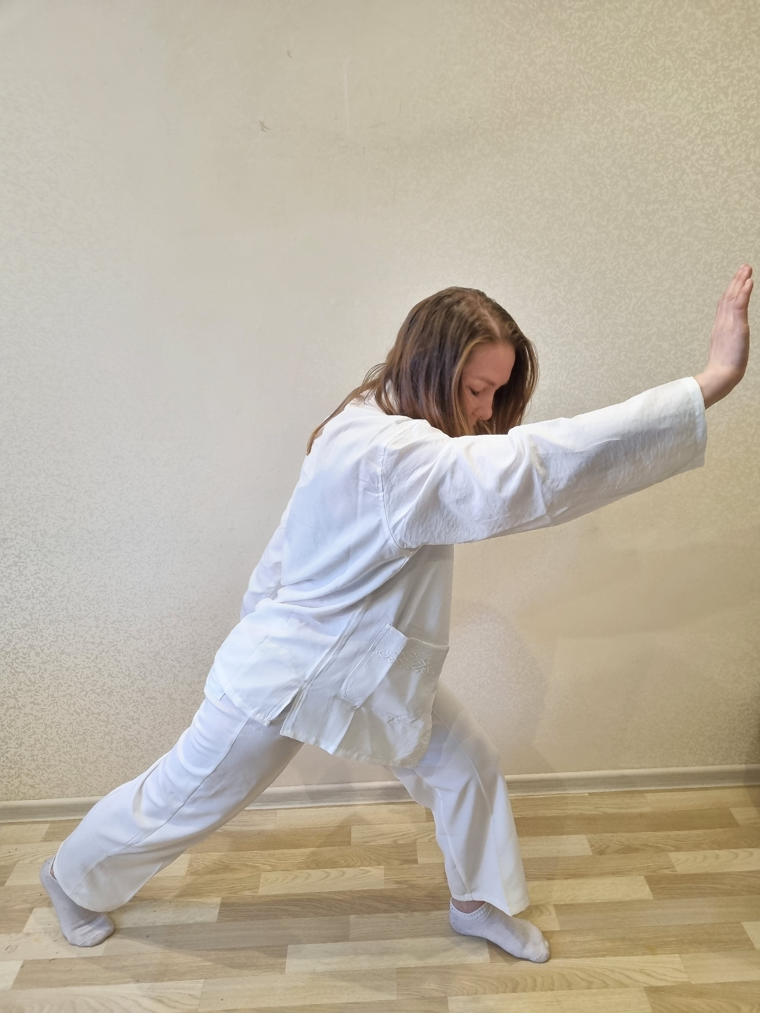 A woman is indoors in a room in Chaikovsky, Russia. She is wearing white clothing and socks and is extending one arm above her head while standing on one leg. The flooring is light-colored wood lamina…read more