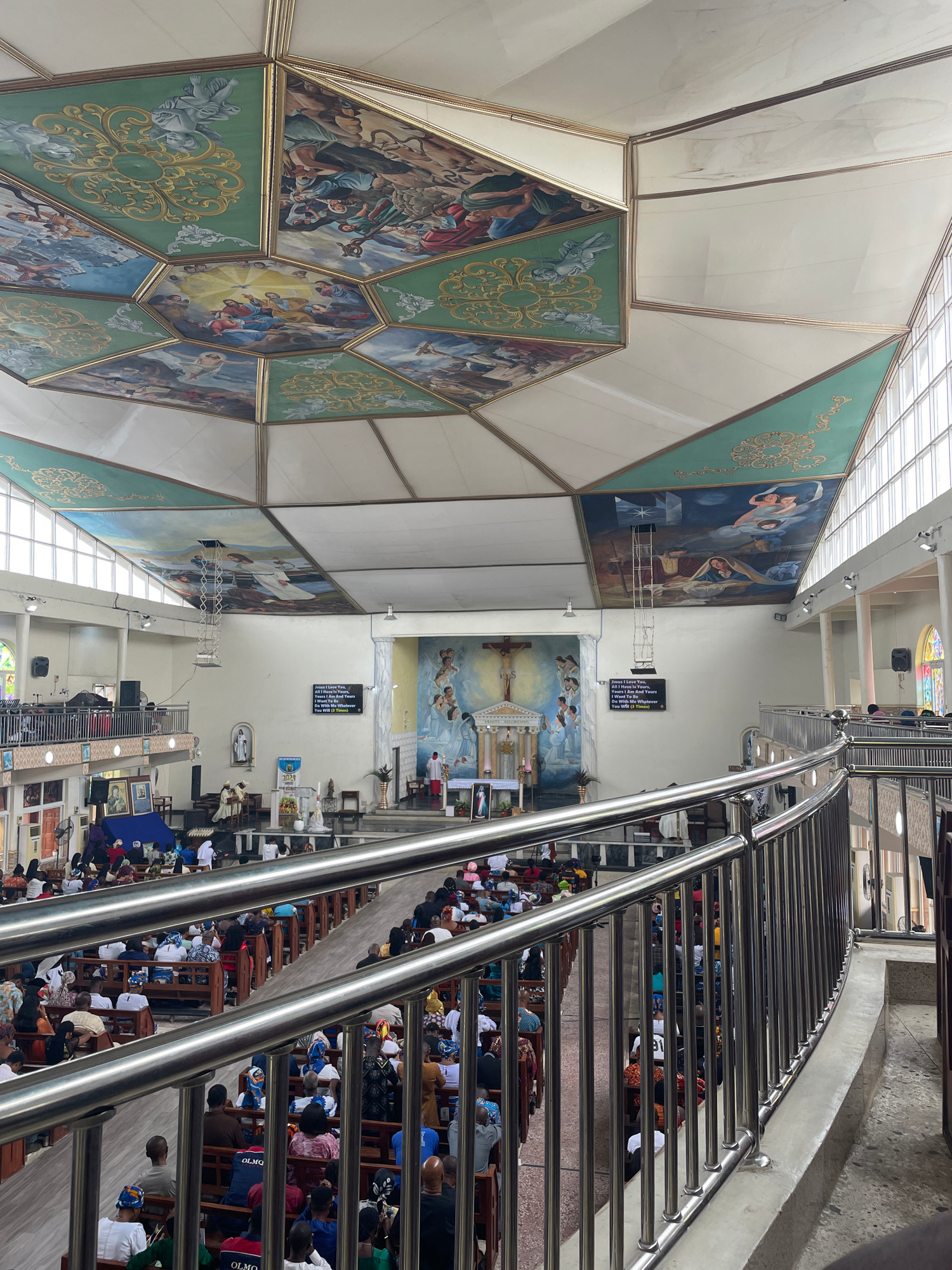The image captures the interior of a church, crowded with people seated in pews during what appears to be a service. A metal staircase railing dominates the foreground, slightly obscuring the view of…read more