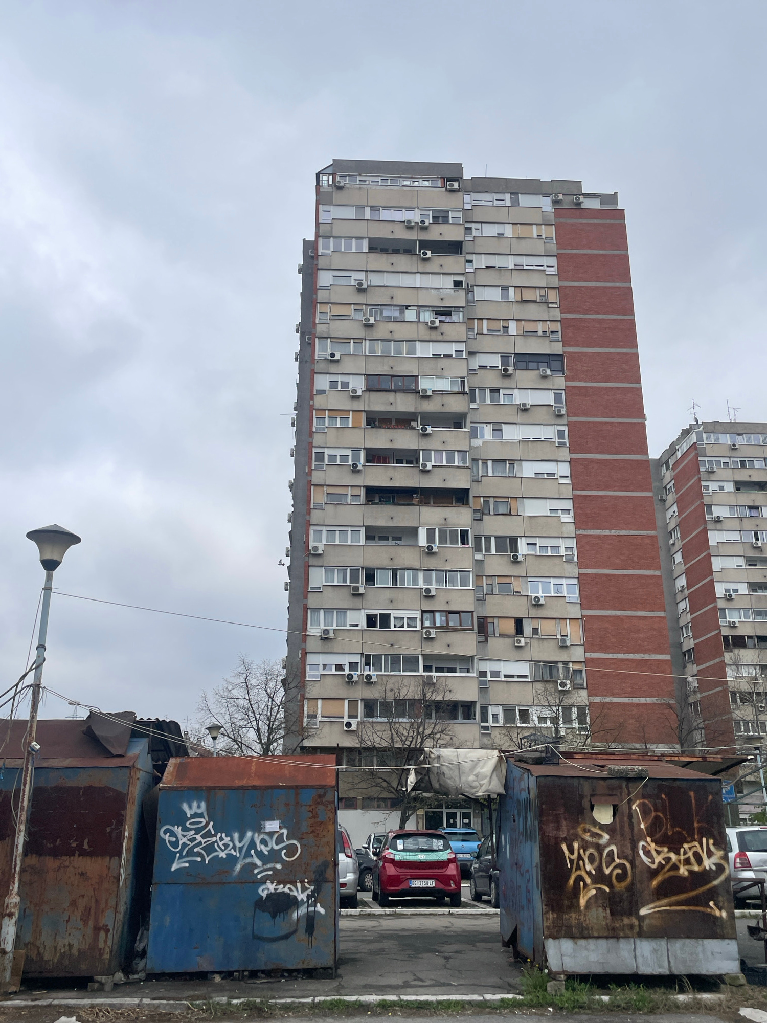 The image depicts a tall, multi-story residential building in Belgrade, Serbia. The building is constructed with a concrete frame and features rows of windows and air conditioning units. A section of…read more