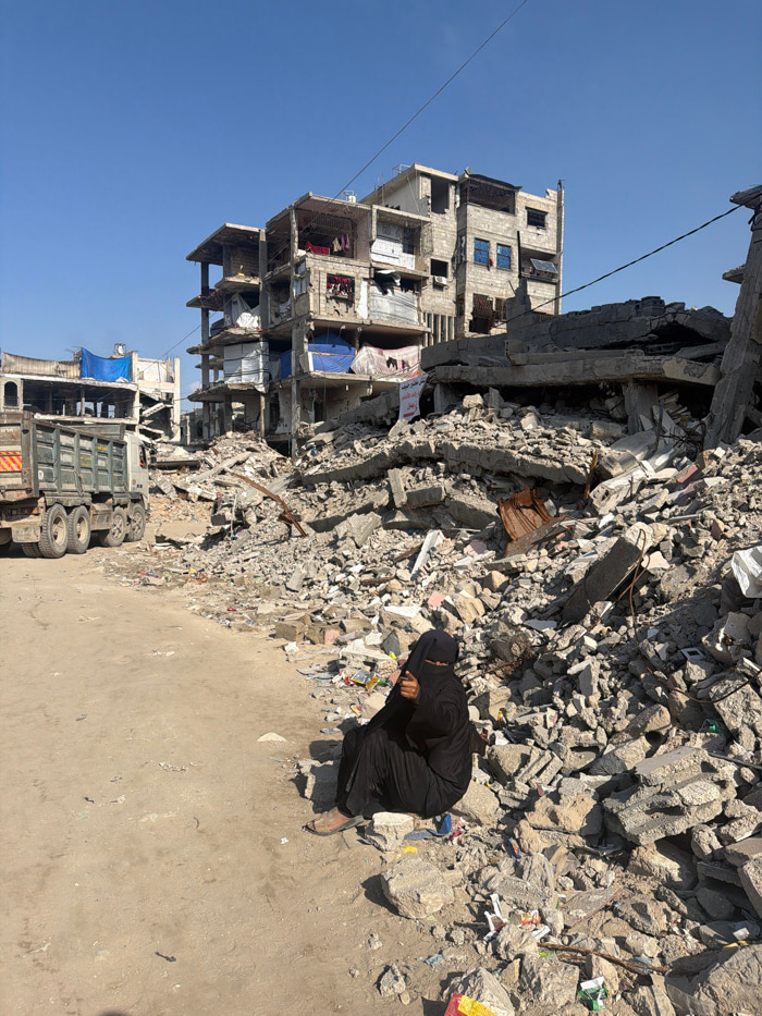 A woman in a black hijab and dress stands near a massive pile of rubble from a destroyed building. The building behind her is severely damaged, exposing its inner structure and belongings, with laundr…read more