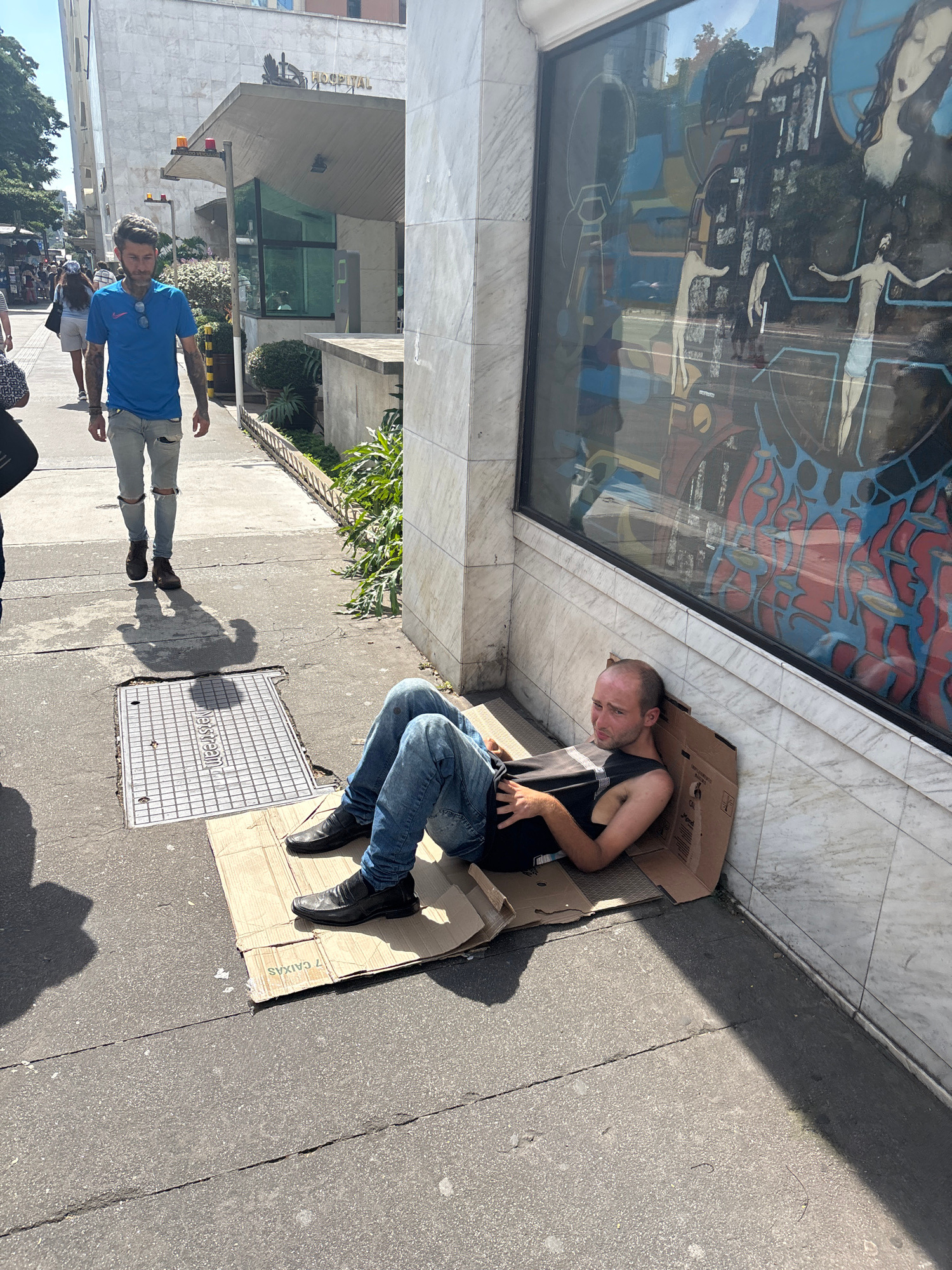 A man is sitting on cardboard on a sidewalk next to a building. He is wearing blue jeans, a black tank top, and black shoes. He appears to be looking down. Behind him is a large window. In the window,…read more
