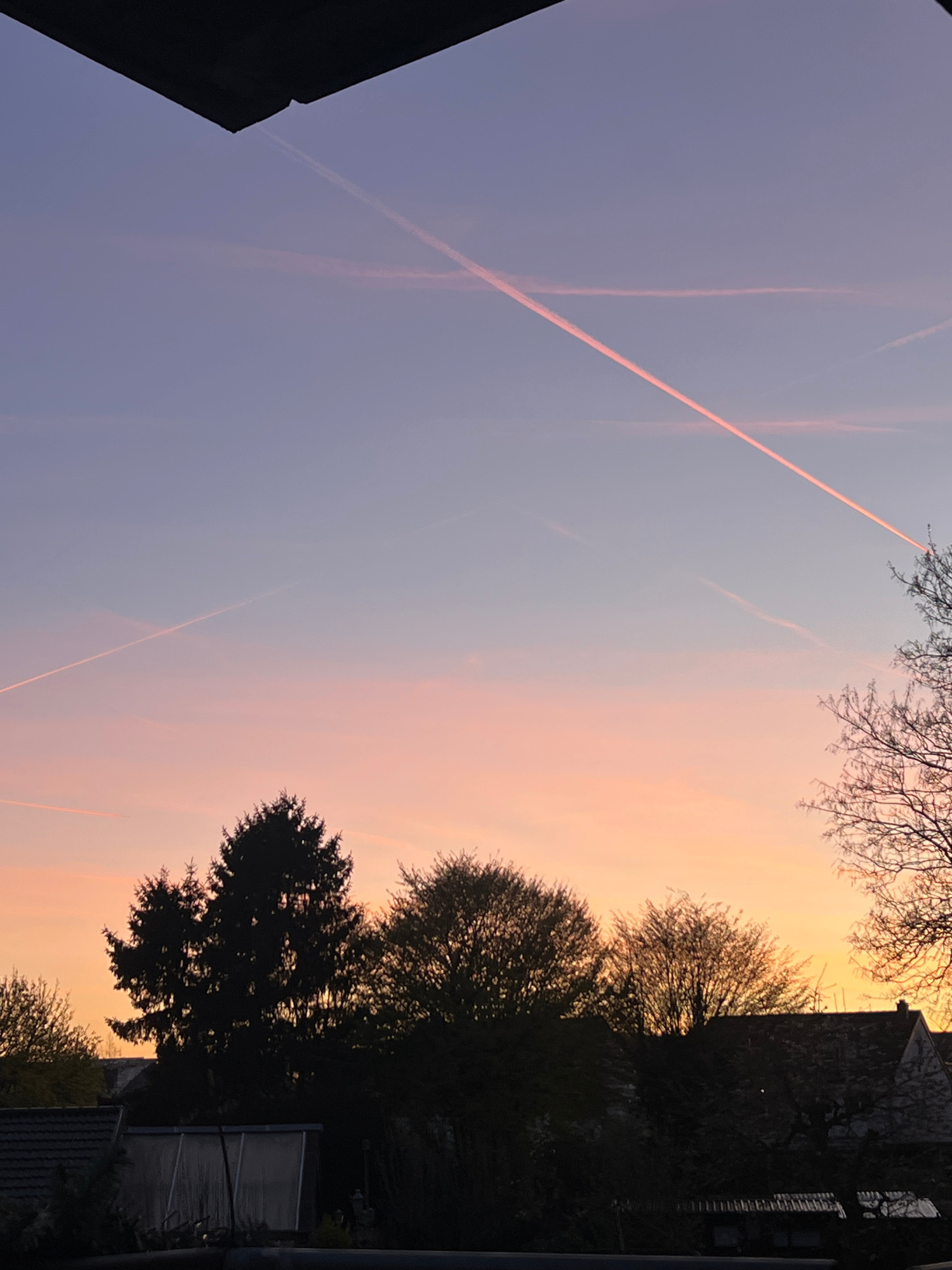 The image shows a sky at dusk in Würselen, Germany. The sky has a gradient of colors, transitioning from a pale blue-purple at the top left to a peachy orange towards the horizon line. Several contrails cut through the sky. Silhouetted trees and building edges frame the view, obscuring details of the surrounding environment. | Open Wire