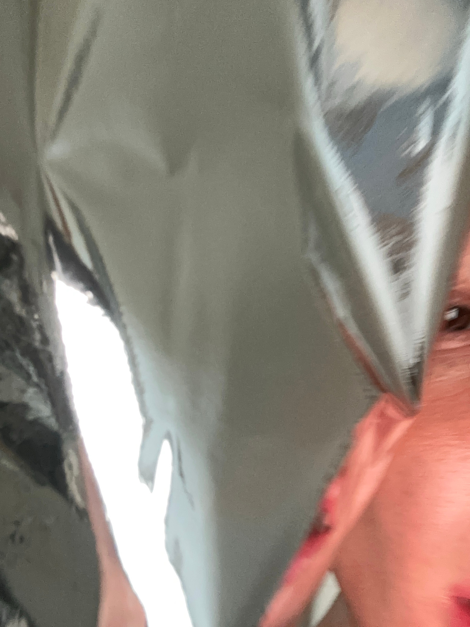 The image displays a close-up, highly reflective surface, possibly Mylar or metallic foil, dominating the upper and central portions of the frame with a metallic grey sheen and visible creases. A brig…read more