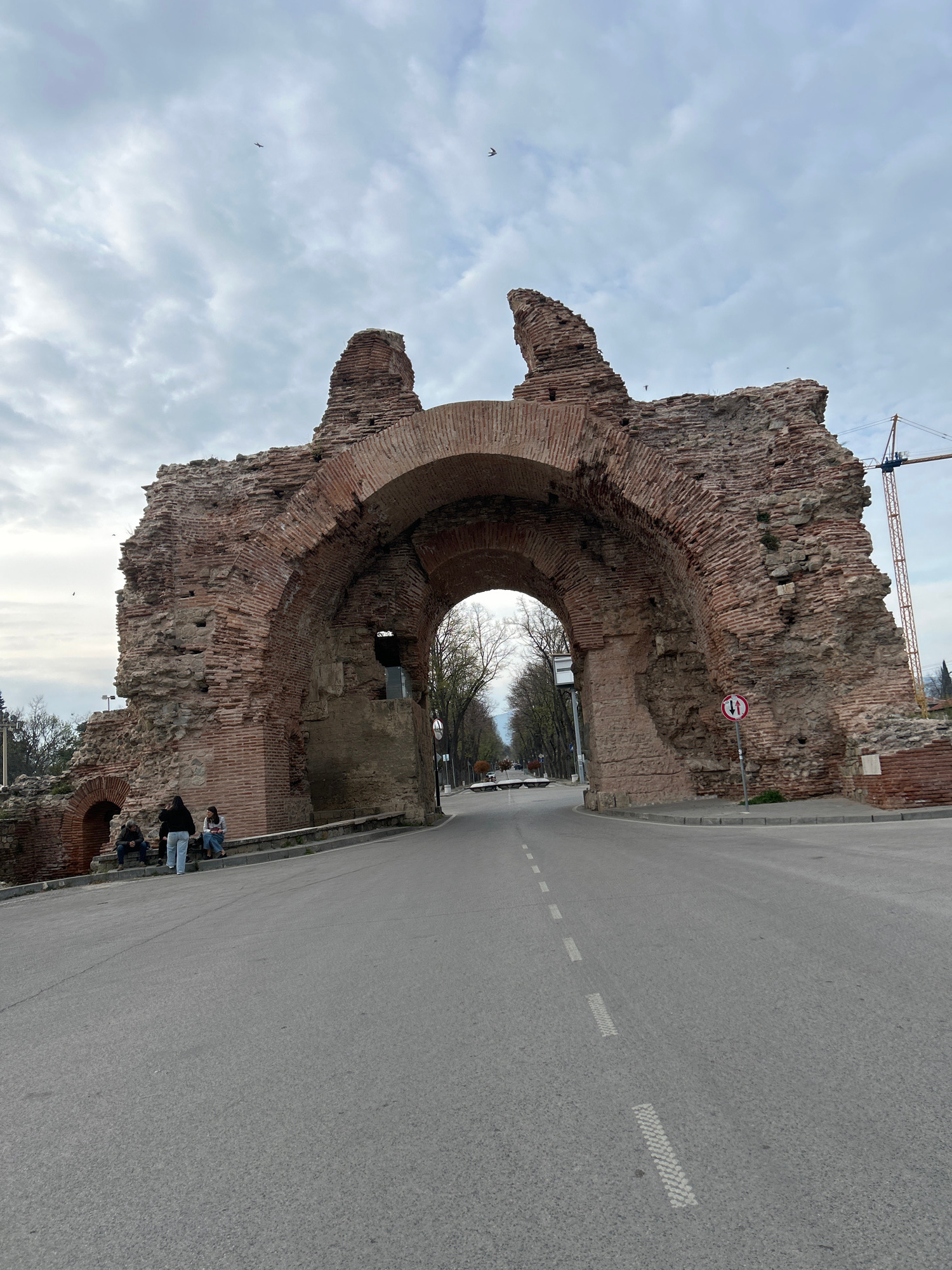 The image displays a significant portion of ancient brick and stone ruins, likely a Roman archway, under a cloudy sky in Hisarya, Bulgaria. The large arch, constructed from weathered reddish-brown briβ¦read more