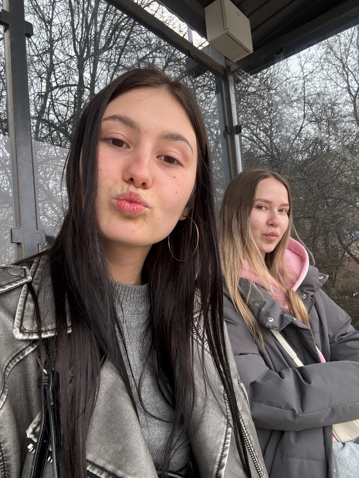 Two young women are captured in a vertical-oriented photo, likely taken in Chaikovsky, Russia, within what appears to be an outdoor shelter, possibly a bus stop. The setting indicates an overcast day…read more