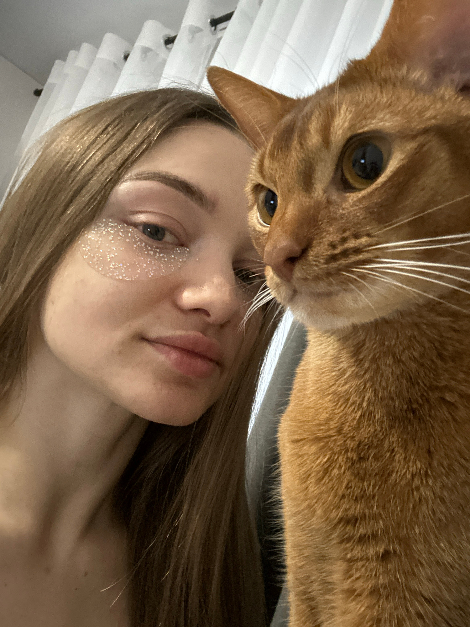 A close-up, slightly tilted photograph shows a woman lying on her back with an orange cat hovering over her face. The woman has fair skin, light brown hair, and appears to be wearing glitter around he…read more