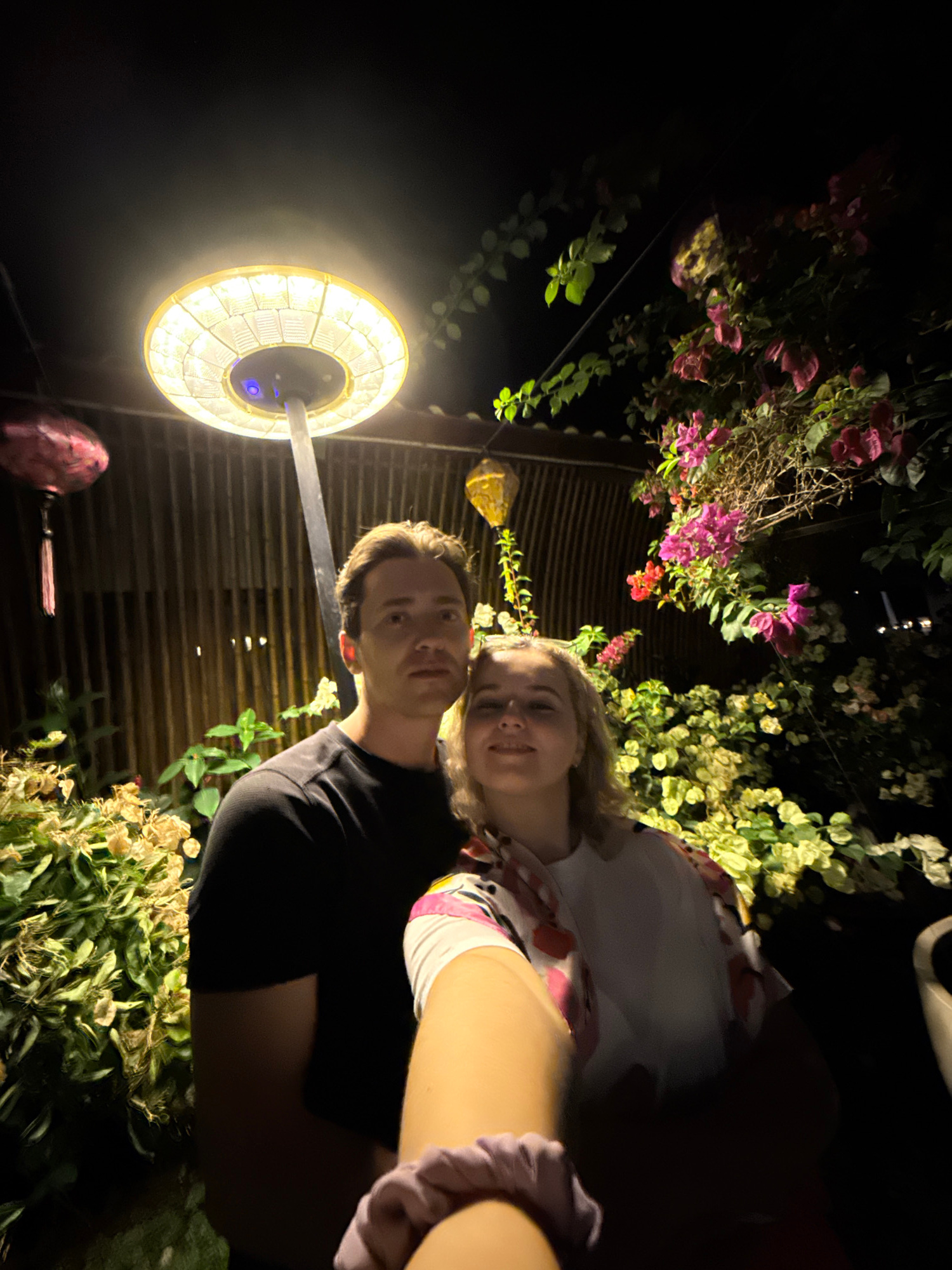 Two individuals are visible in the nighttime image, framed amidst foliage illuminated by an artificial light source. A circular light fixture mounted on a pole illuminates the scene, revealing wooden…read more