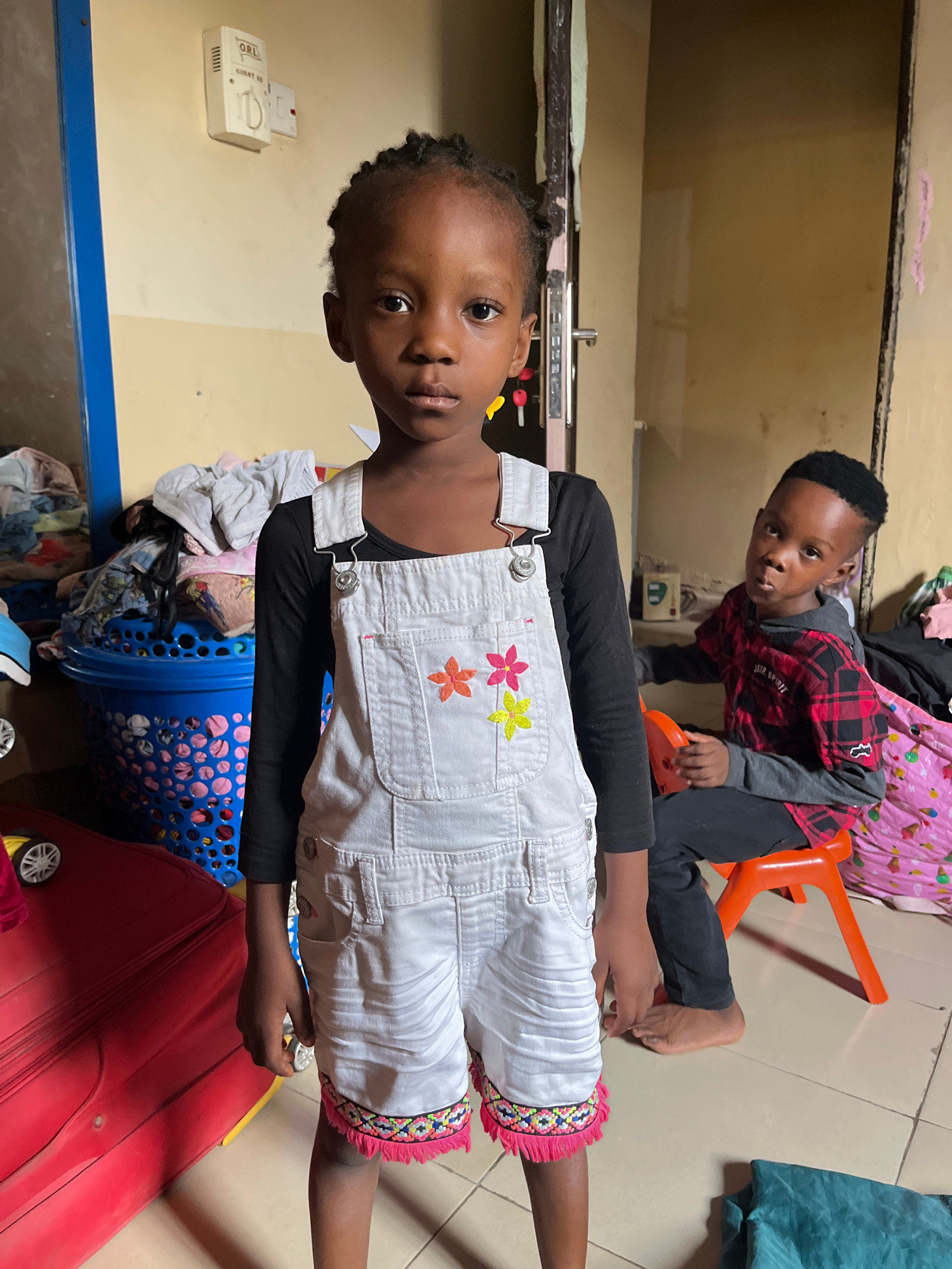 Two children are positioned indoors in Madalla, Nigeria. A girl wearing a black long-sleeve shirt and white overalls with embroidered flowers stands near a blue laundry basket overflowing with clothes…read more