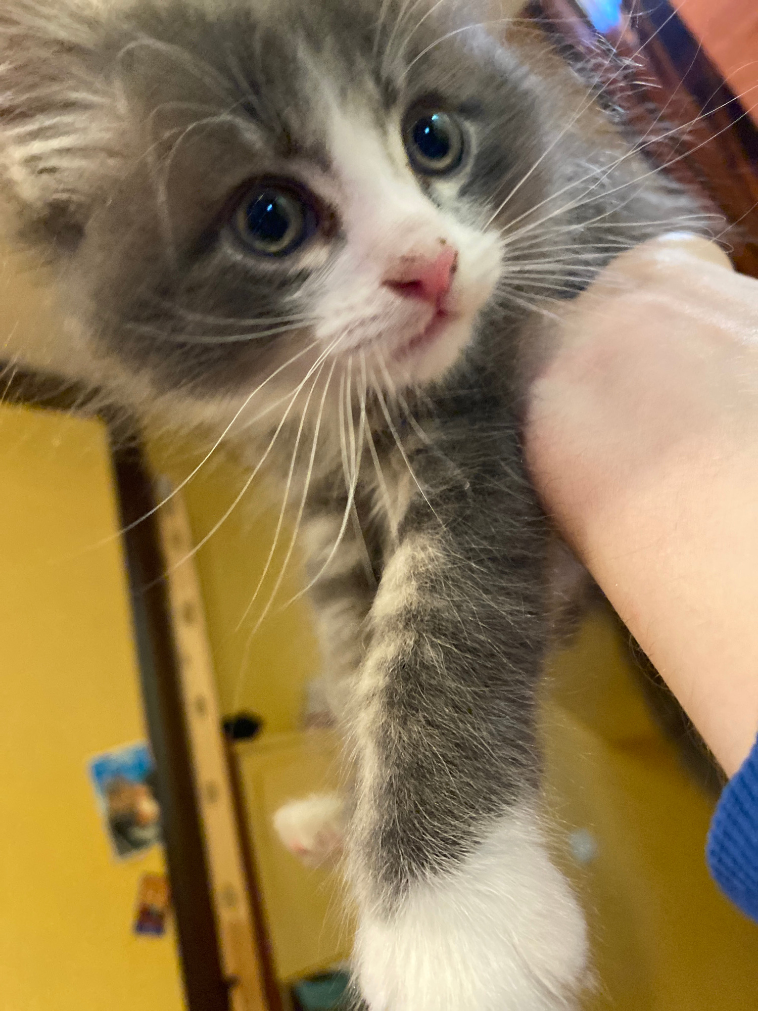 A close-up, tilted photograph captures a fluffy, grey and white kitten being held. The kitten is the central subject, looking directly at the camera with wide, curious blue eyes. Its face is predomina…read more