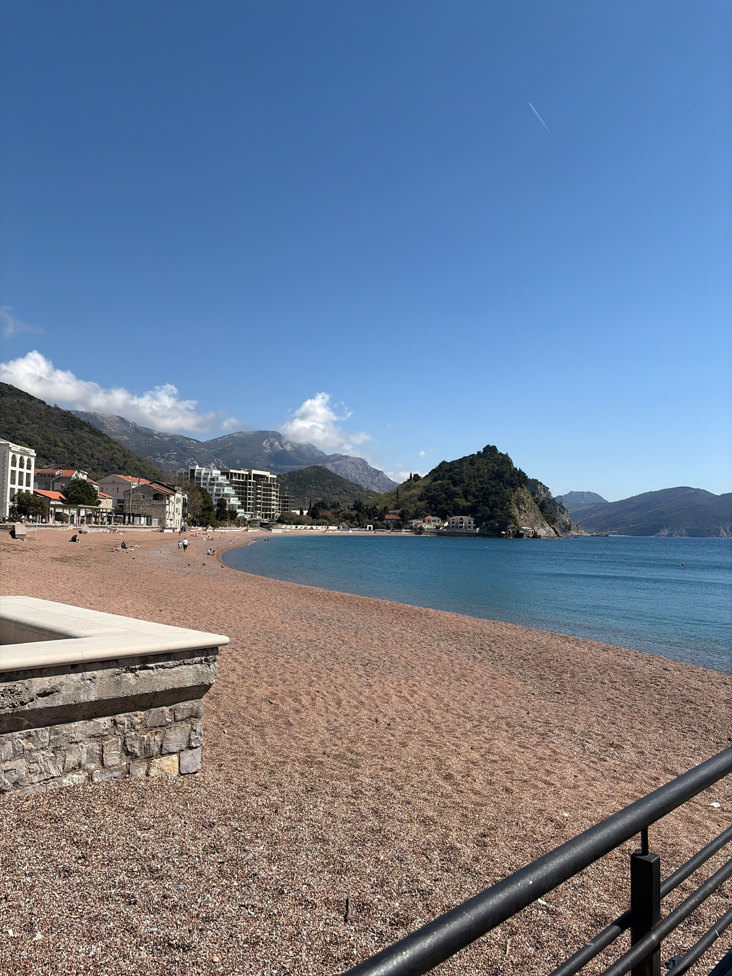 The image shows a beach on a sunny day, with a clear blue sky. The beach is a mix of sand and pebbles. In the distance, there are mountains with some clouds. There are buildings visible along the coas…read more