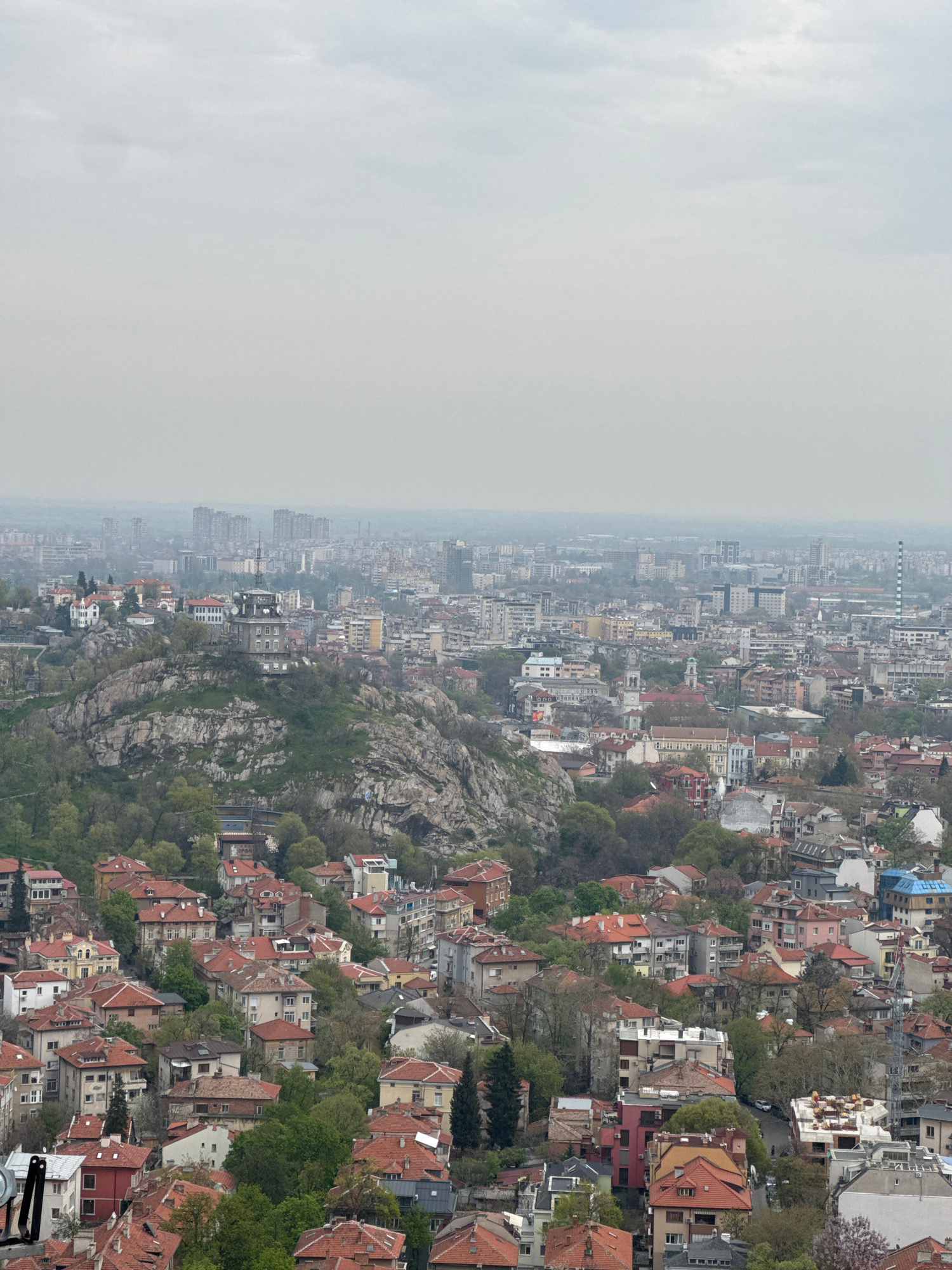 This aerial or high-vantage-point image captures a sprawling cityscape, identified as Plovdiv, Bulgaria, under an overcast and hazy sky. The photograph is oriented vertically, showing the horizon lineβ¦read more