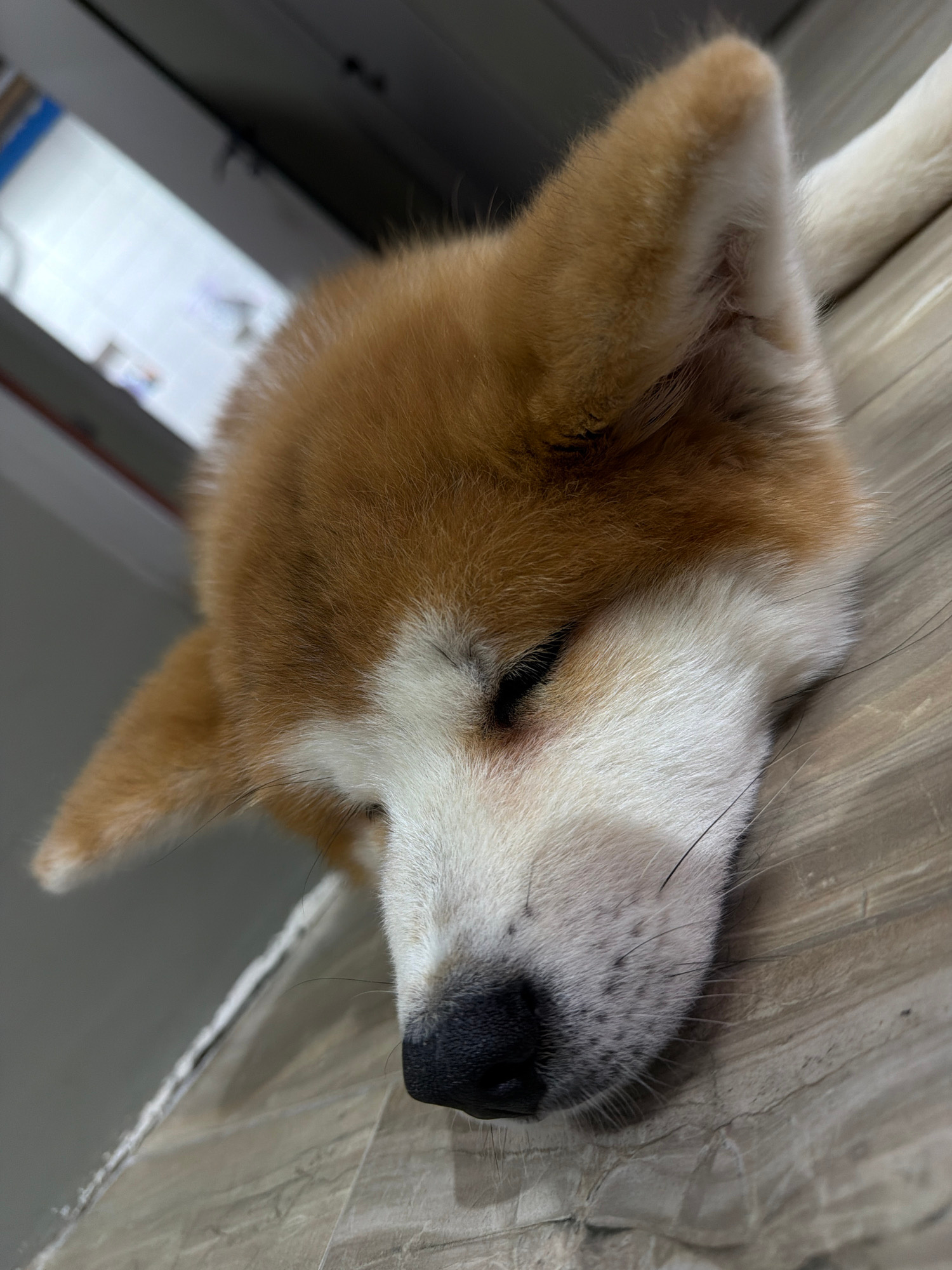 A close-up shot depicts the head of a sleeping Akita dog, lying on a floor with a wood-grain pattern. The dog has a mix of white and light brown fur, and its eyes are closed. The background is indisti…read more