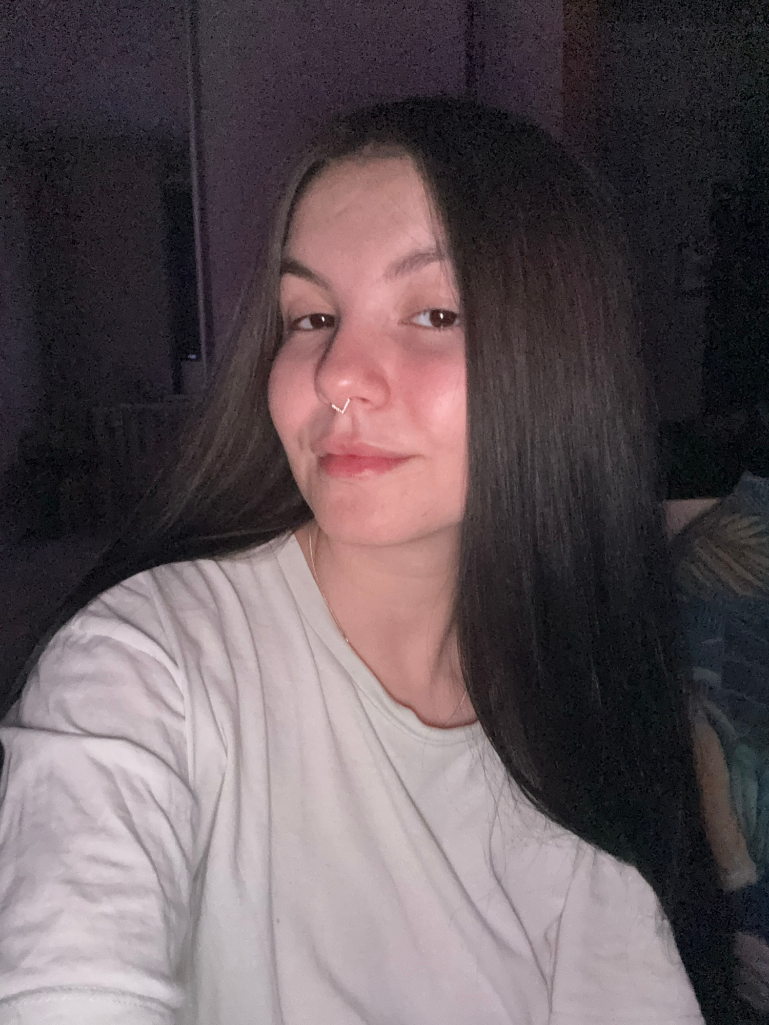 A young woman with long, straight dark hair is pictured in a selfie-style shot. She is wearing a light-colored t-shirt and has a small, metallic nose ring in her left nostril. The background is dark a…read more