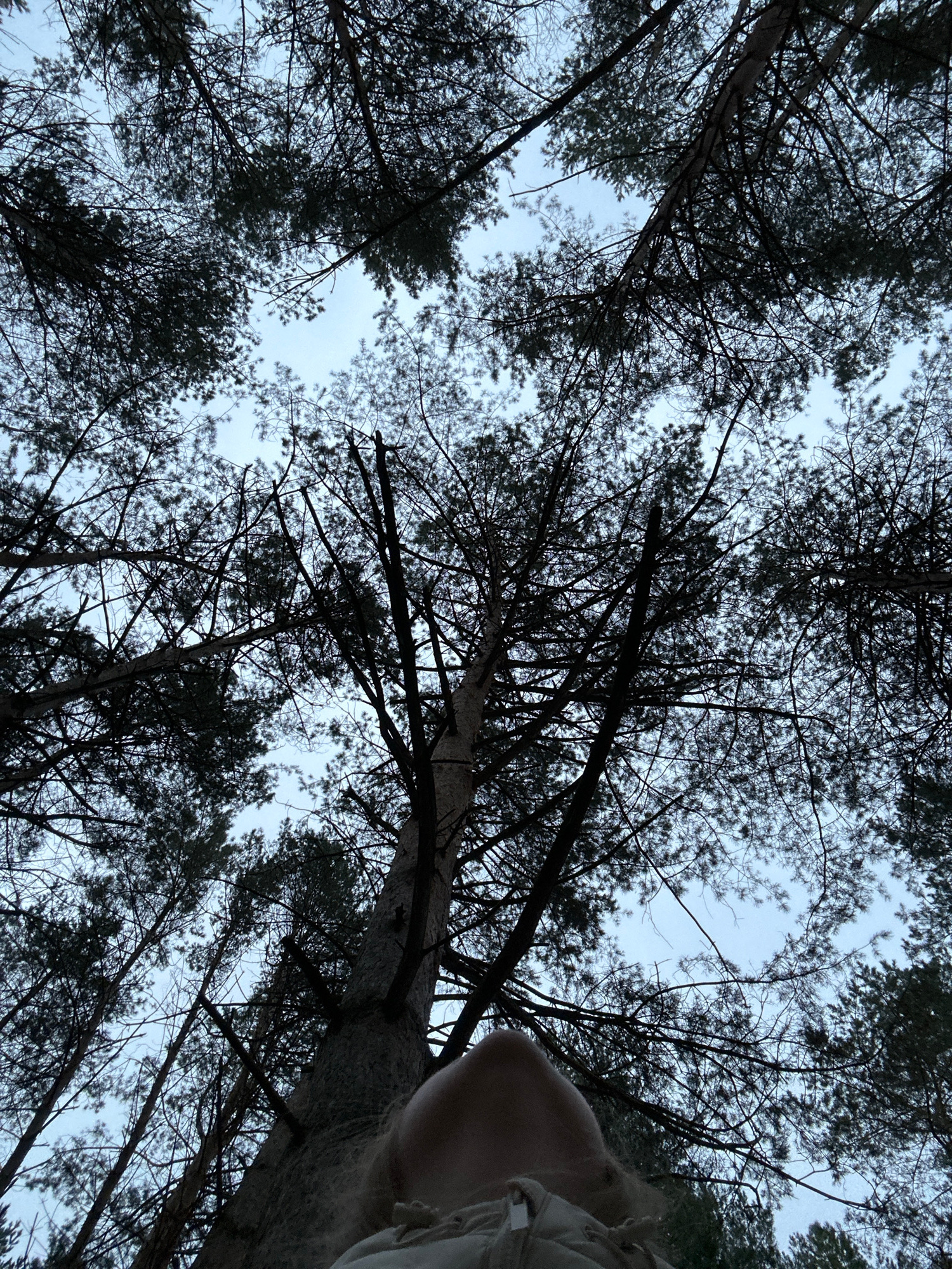 The image is a low-angle shot looking up through the canopy of a pine forest. The location is likely in Chaikovsky, Russia. The trees are tall and slender, with dark silhouettes against a light gray s…read more