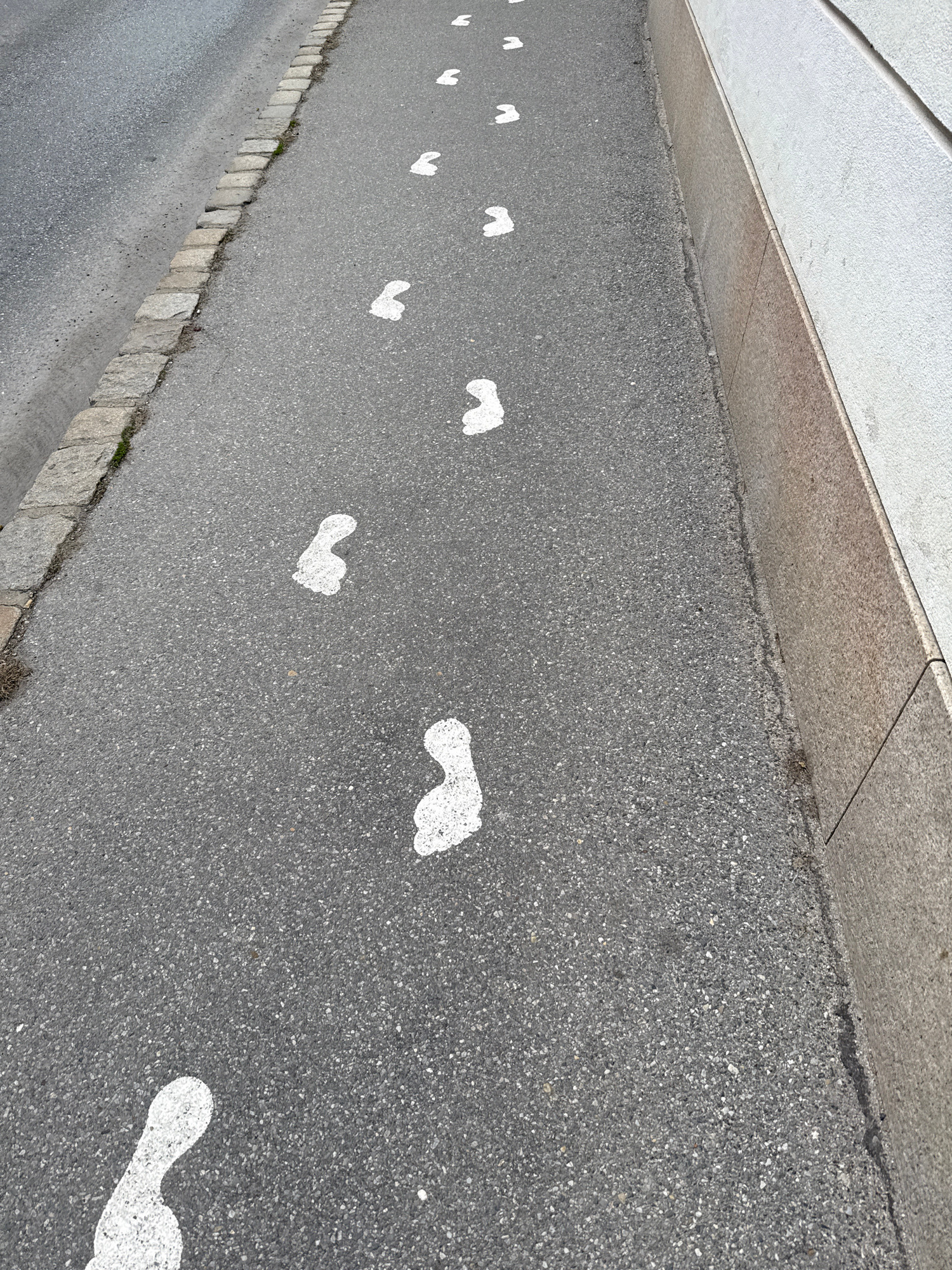 This image, taken in Hainburg an der Donau, Austria, provides an angled overhead view of an outdoor paved area. The primary subject is a dark gray asphalt path featuring numerous white, footprint-like…read more