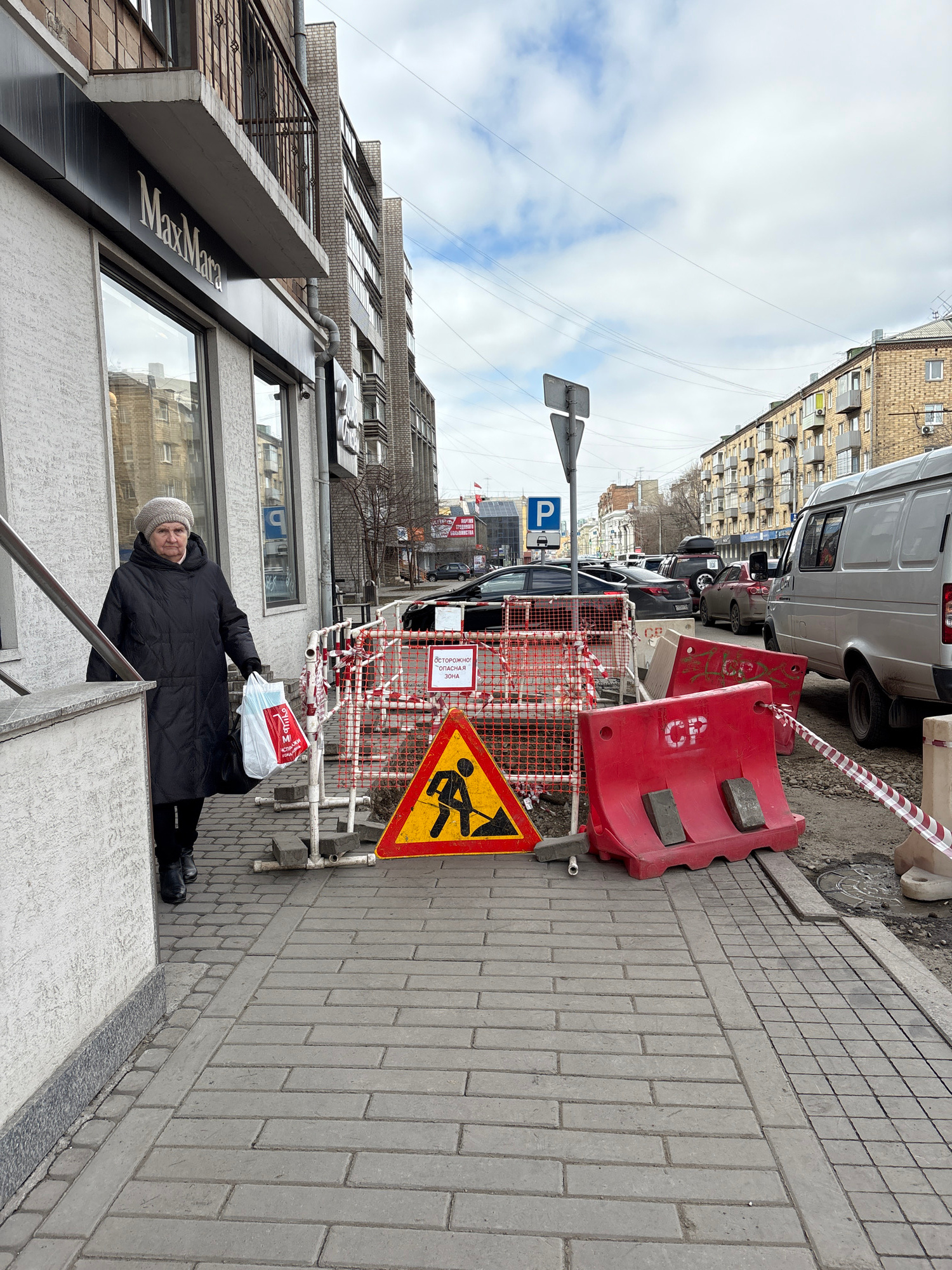 The image captures an urban street scene in Krasnoyarsk, Russia, during daytime under an overcast sky. In the foreground, a person, likely a woman, is standing on a paved sidewalk, leaning slightly ag…read more
