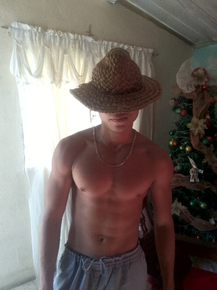 A shirtless man wears a straw hat that obscures his face. He also wears gray pajama pants and a gold chain. A sheer white curtain hangs behind him near a bright window. To the right, there is a Christ…read more