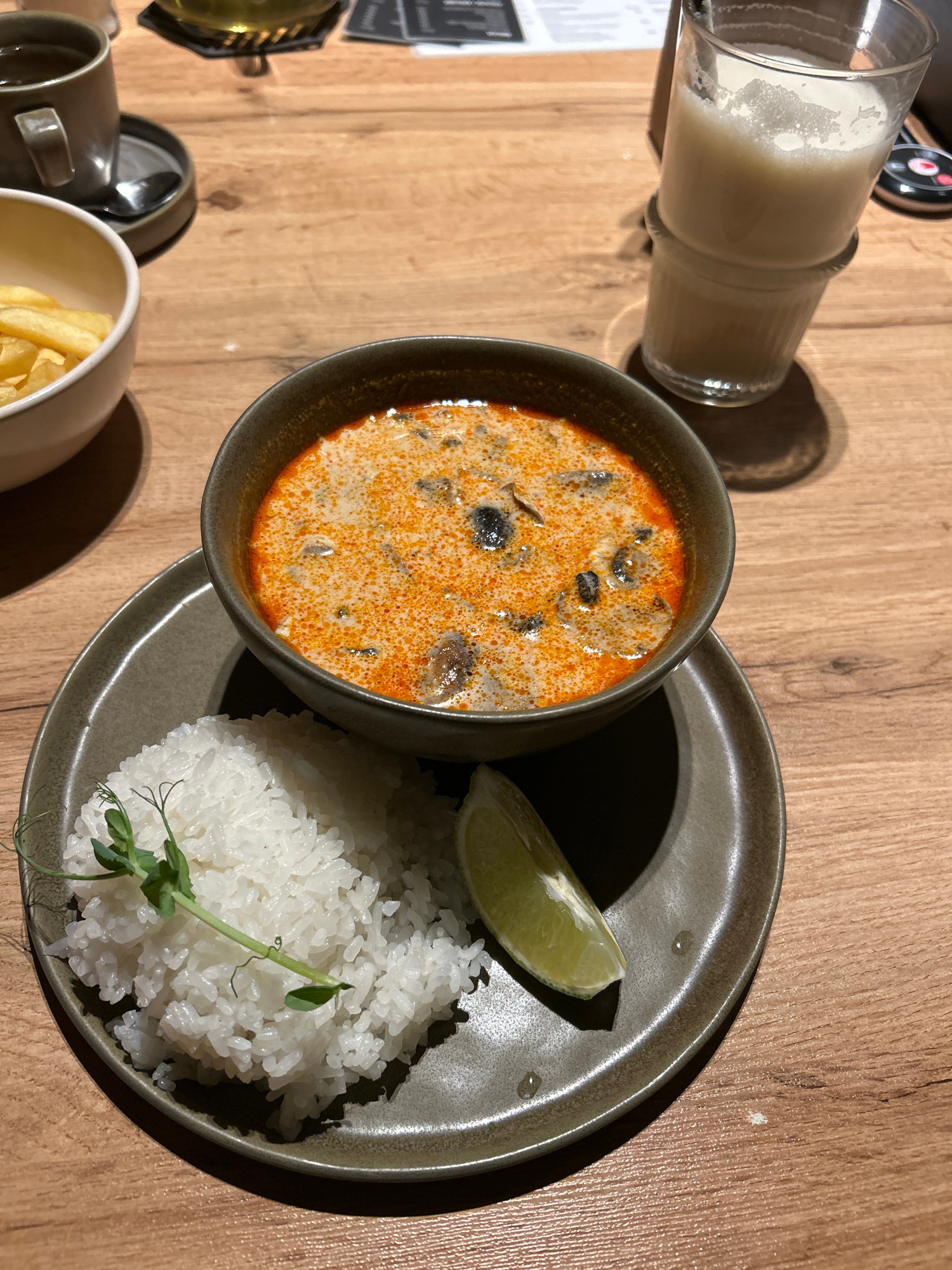 This overhead shot captures a meal laid out on a light-colored wooden table. The central subject is a dark gray ceramic bowl filled with a creamy, orange-colored soup, featuring visible dark pieces, p…read more