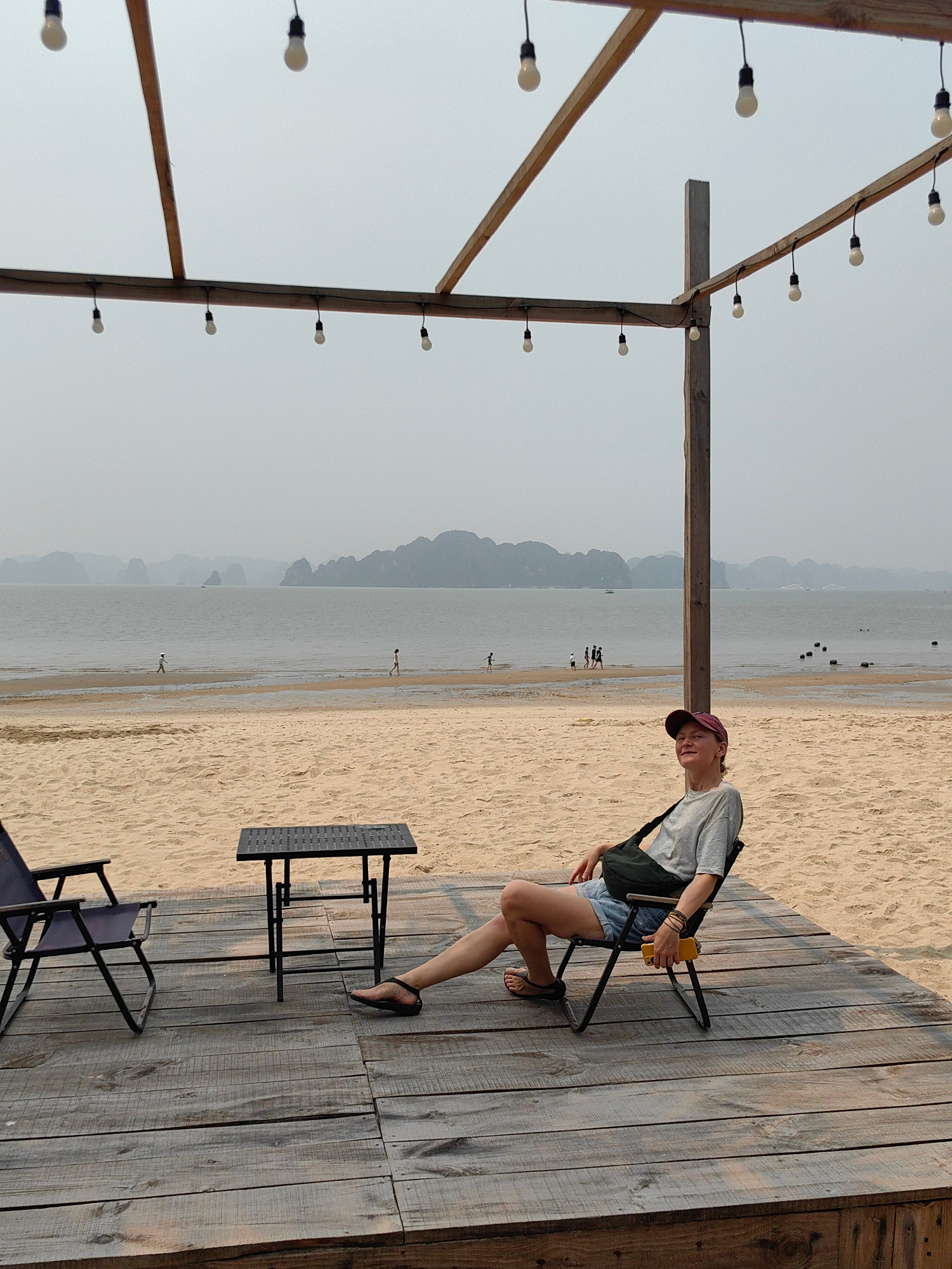 A medium shot reveals a woman reclining in a camp chair on a wooden deck at a beach. The deck features a second chair and a small, square table. The beach extends to the sea, where several people are…read more
