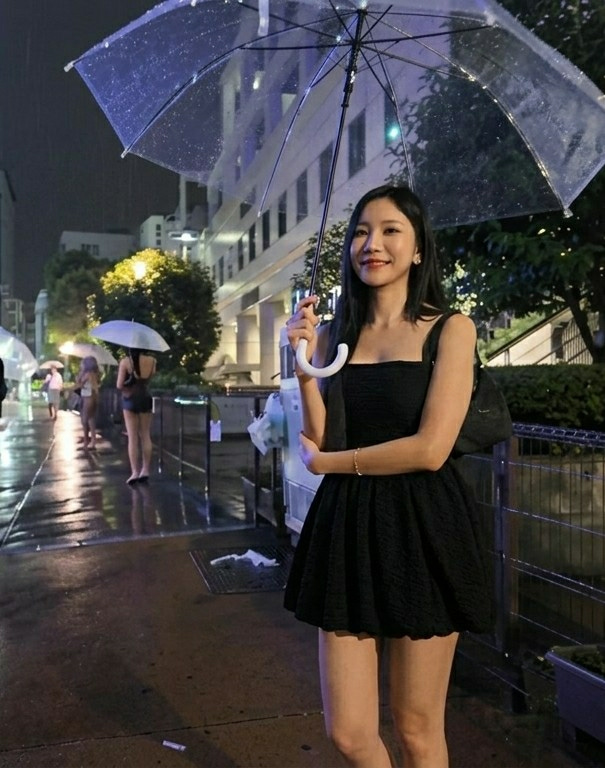 The scene depicts an urban street at night in Shinjuku, Japan, under rainy or recently rainy conditions. A young East Asian female stands in the foreground, centered, looking directly at the viewer wi…read more