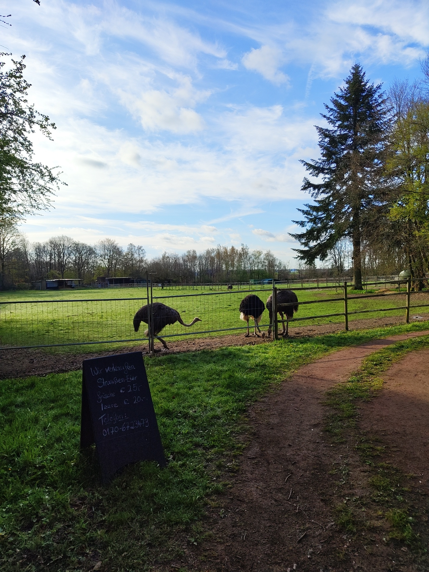 The image shows an outdoor scene in Mettlach, Germany, featuring a fenced enclosure where three ostriches are kept. A sign in German reads "Wir verkaufen Straußen-Eier frische € 25, - leere € 20,- Tel…read more