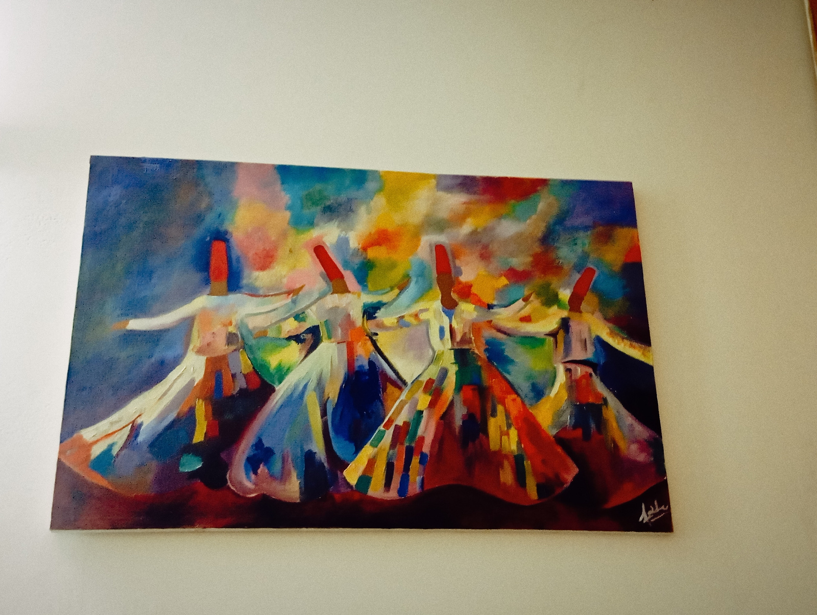 The image shows a painting depicting four whirling dervishes. The painting is hung on a light beige wall. The style is impressionistic, with vibrant colors including red, yellow, blue, and green, used…read more