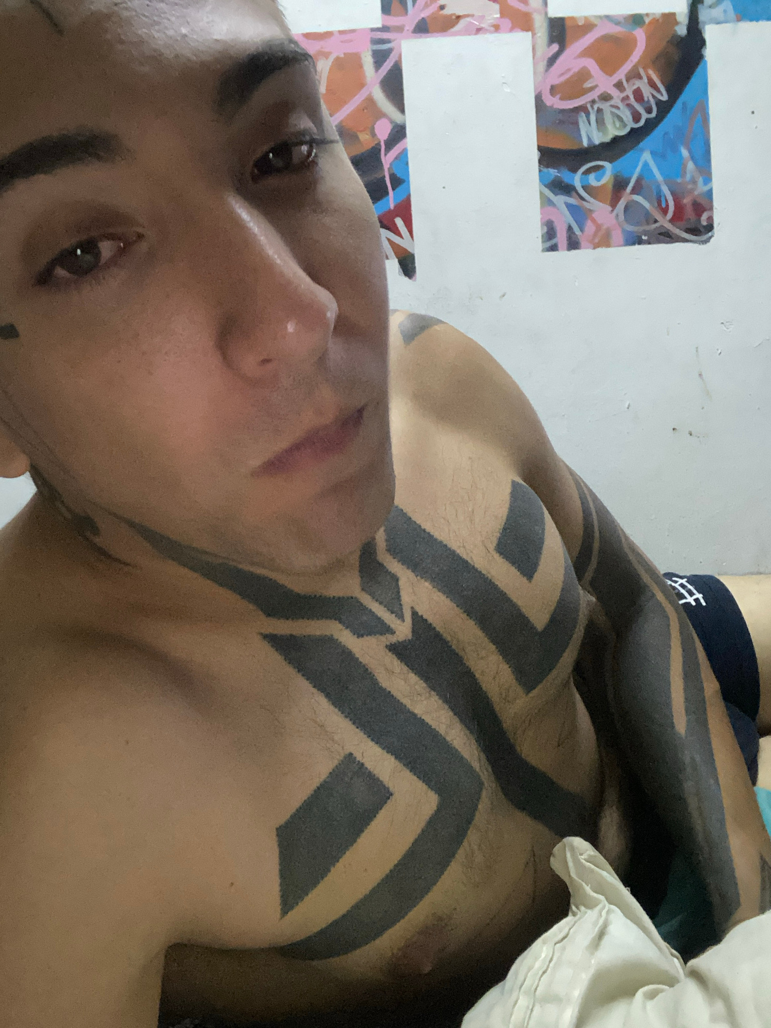 A close-up, low-angle shot features a shirtless individual with extensive black geometric tattoos covering their chest, shoulders, and arms. The person is lying down, and their face is prominently dis…read more