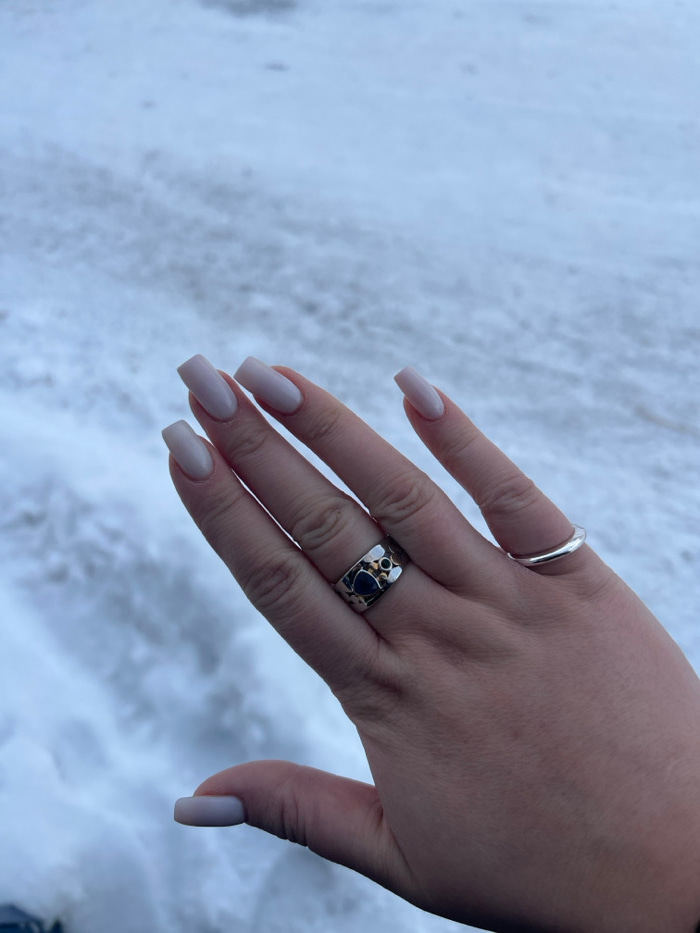 The image features a human right hand, presented with the palm facing downwards. The fingernails of all five visible fingers are uniformly shaped with squoval tips and are painted a pale, light grey-b…read more