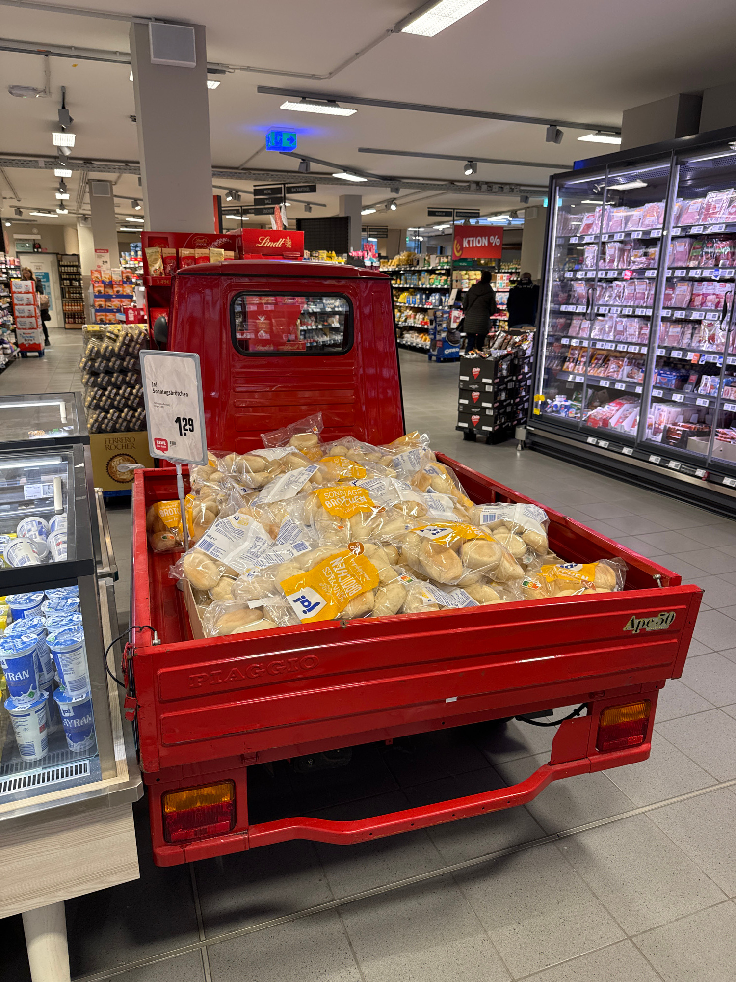Here's a detailed description of the image: **Scene:** The image is taken inside a REWE supermarket. The setting is in Remscheid, Germany. **Objects and Subjects:** * A red Piaggio Ape 50 vehic…read more