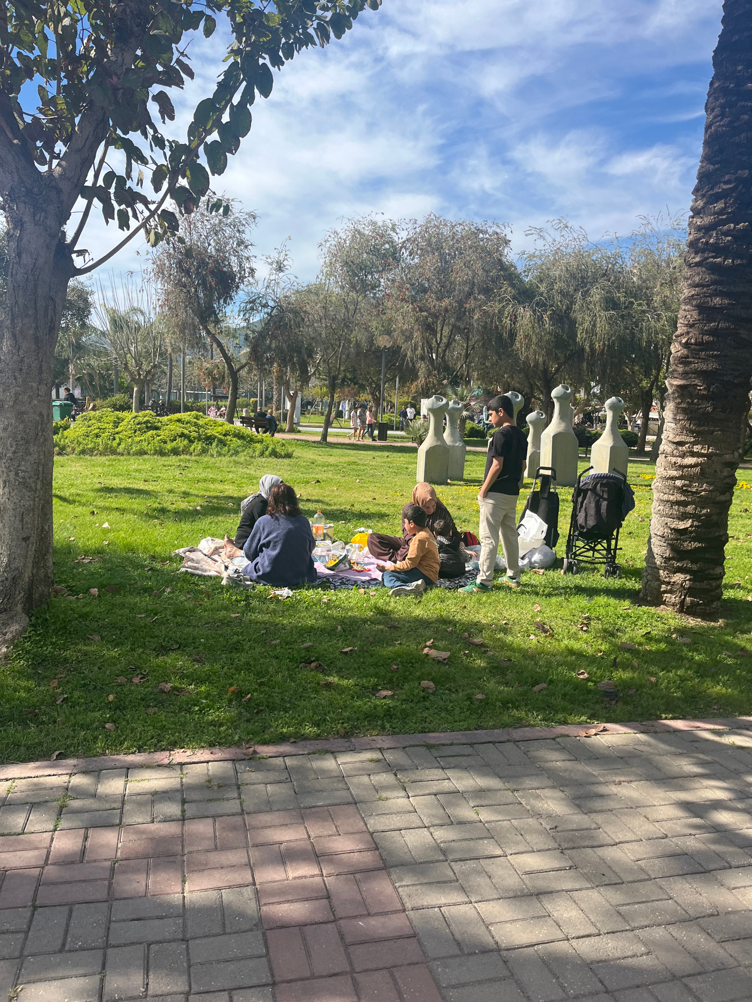 The image depicts a park scene in Alanya, Turkey. Several individuals are picnicking on the green grass. A man stands near a blanket, while two other people are sitting on the ground. Adjacent to them…read more