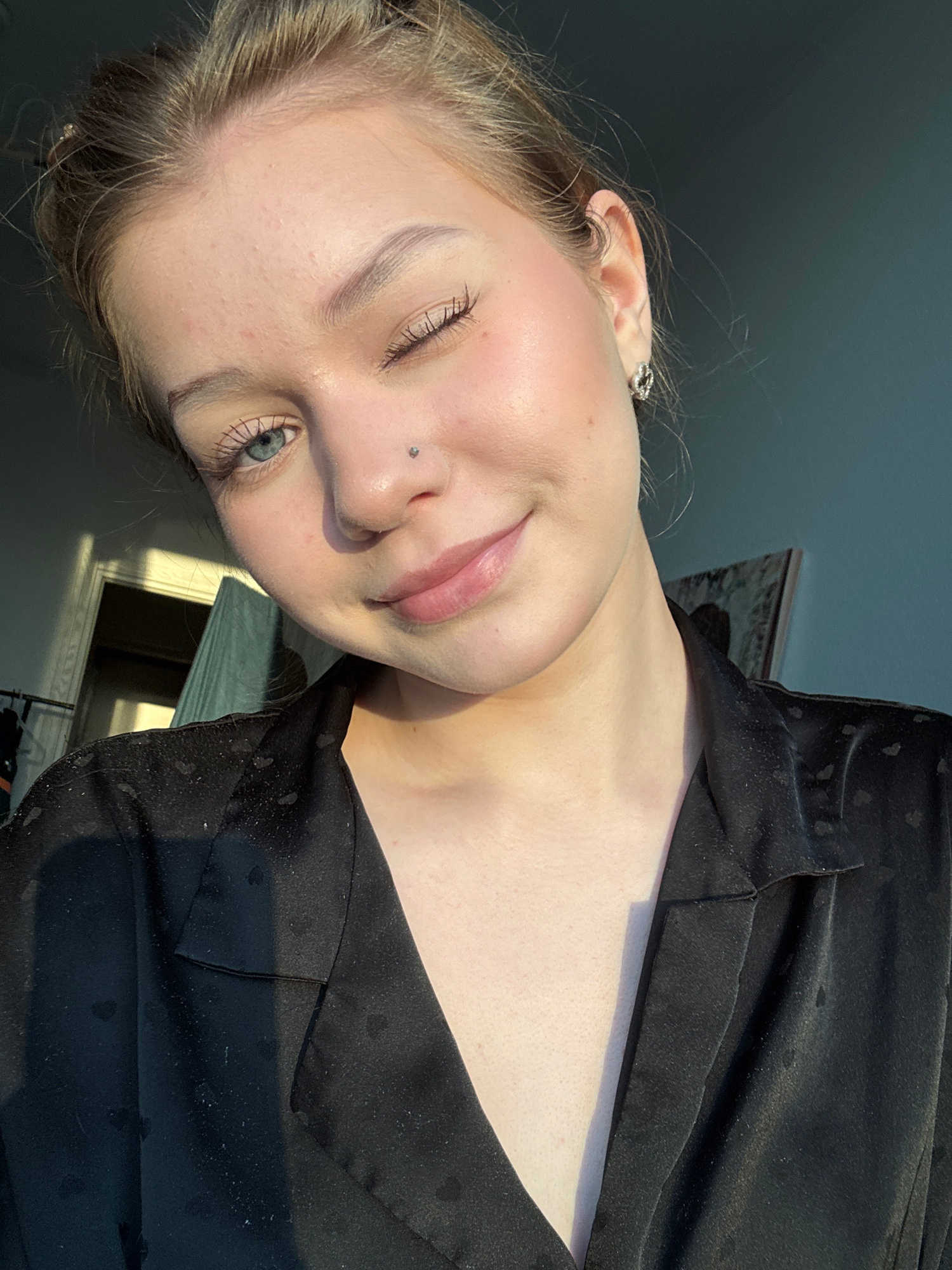 A young woman is depicted in a close-up, angled head and shoulder shot. She has fair skin, light blonde hair pulled back, and light blue eyes. Her lips are a natural pink color. There's a small stud p…read more