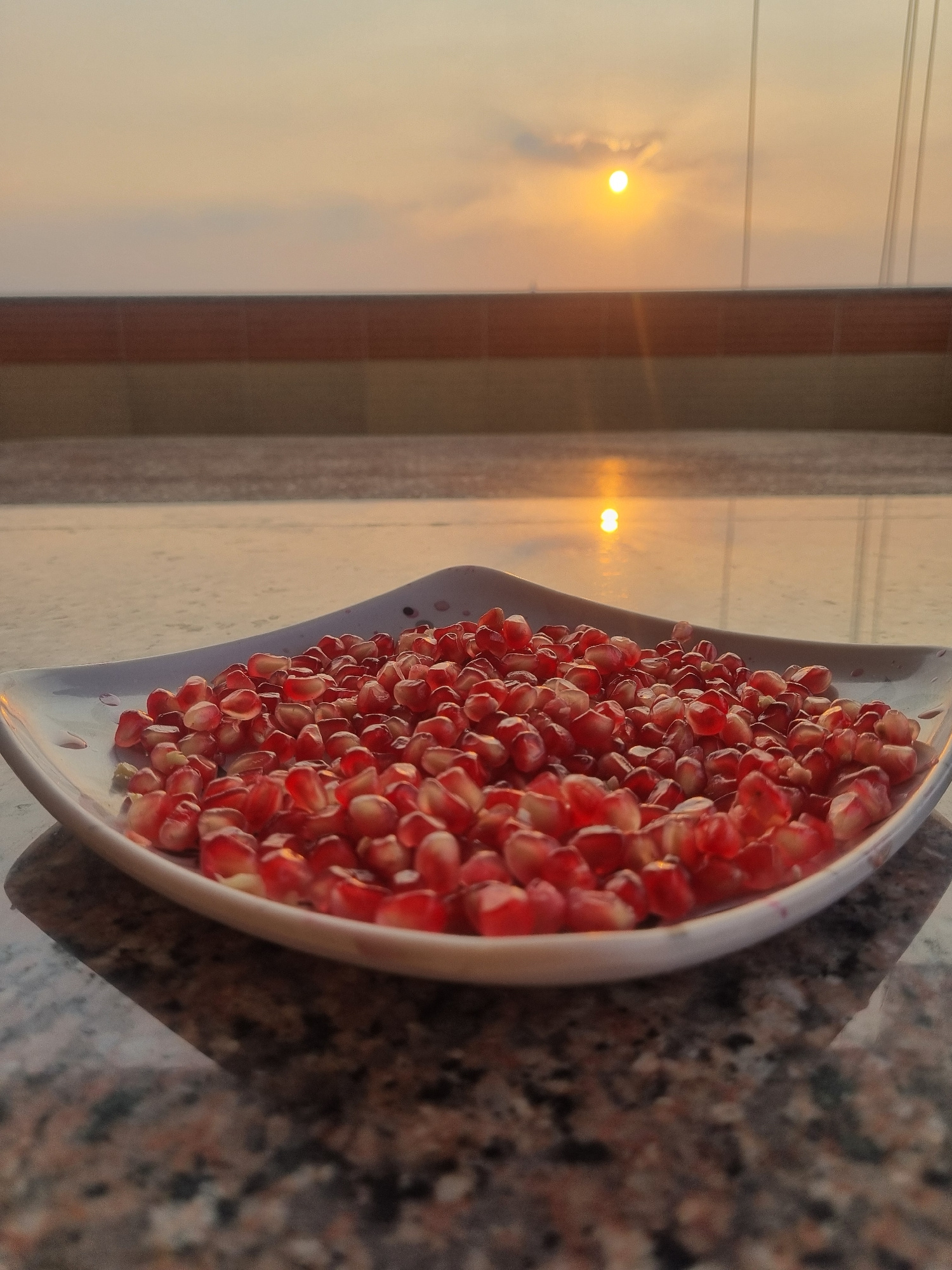 A slightly high-angle, medium shot shows a white, wave-shaped plate filled with pomegranate seeds. The plate sits on a surface with a speckled pattern reminiscent of granite. The scene is lit by the s…read more