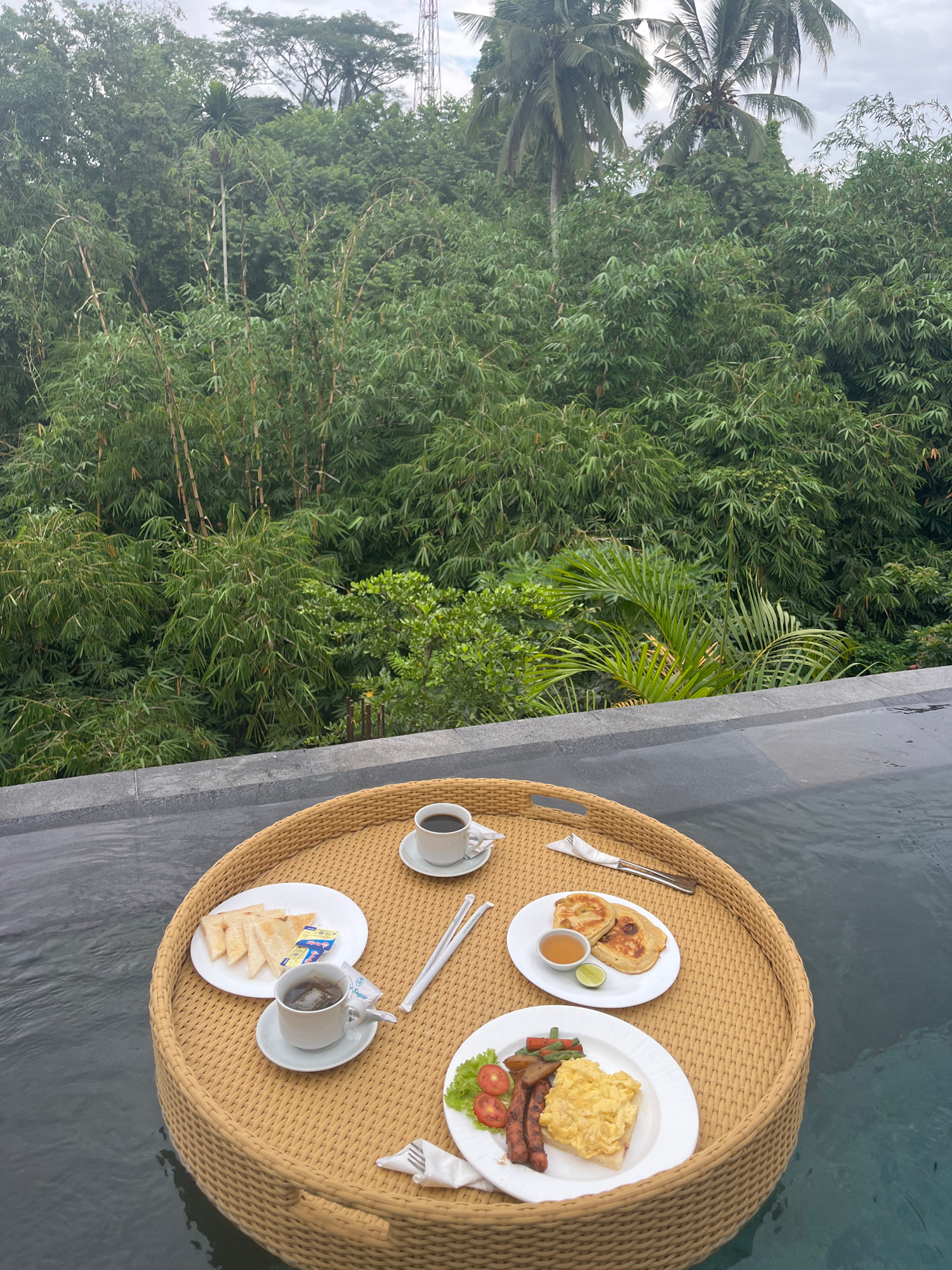 The image captures a luxurious floating breakfast set in a swimming pool, overlooking a dense tropical rainforest in Tegallalang, Indonesia. The perspective is from above, showcasing the meal and theβ¦read more
