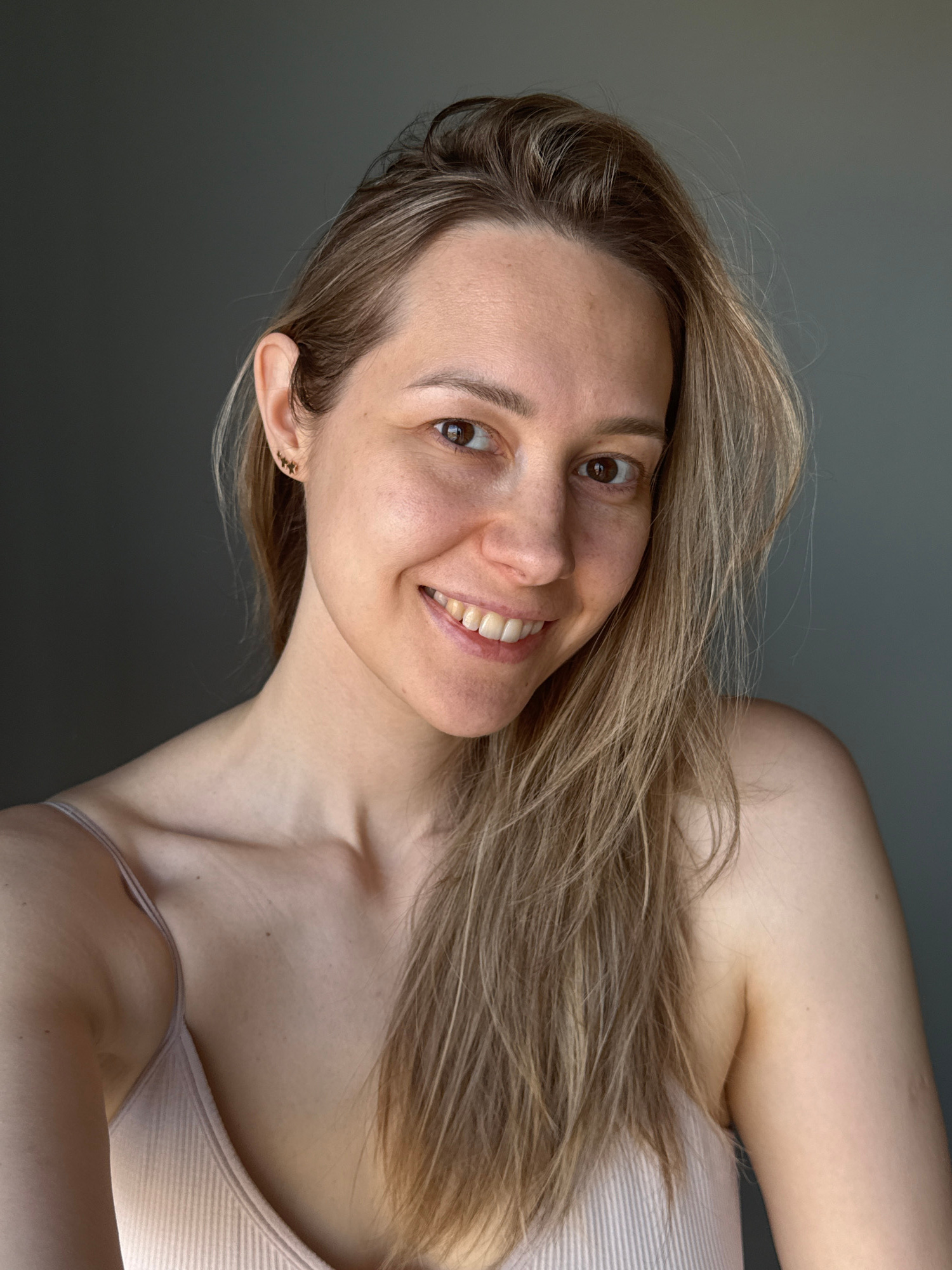 A woman with long blonde hair and brown eyes is smiling at the camera. She is wearing a light pink tank top. She has a fair complexion and a gold stud earring in her left ear. The background is a soli…read more