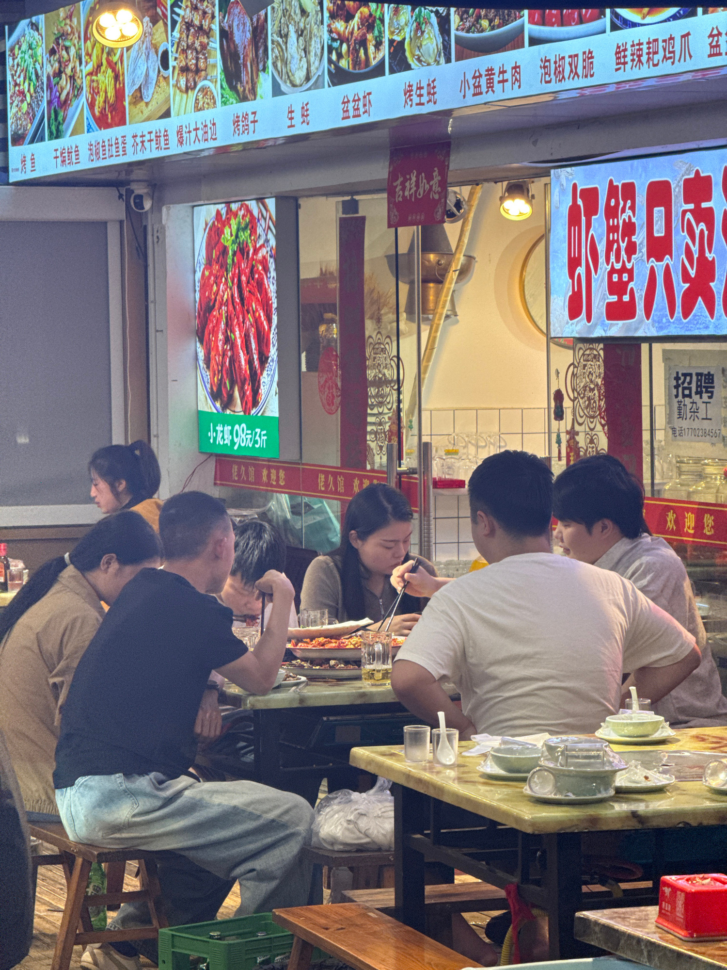 Here's a description of the image: The image shows a group of people eating at an outdoor restaurant in the Yuzhong District of China. Several people sit at tables, eating and socializing. Food is on…read more
